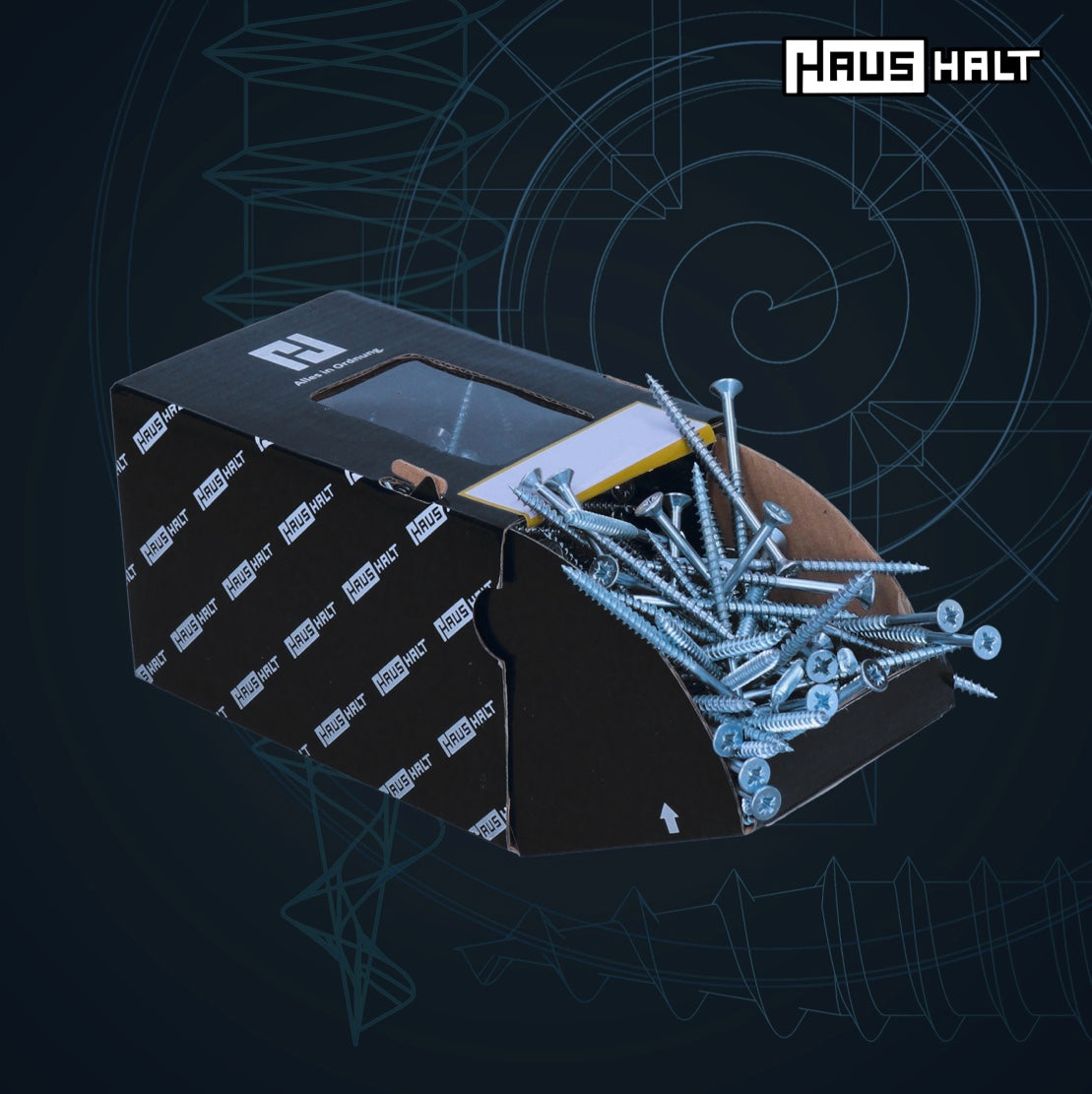 La vis à bois HausHalt avec support Pozidriv garantit à l'utilisateur un haut niveau de flexibilité grâce à son applicabilité universelle dans le bois. La tête fraisée garantit que la vis est fraisée proprement et affleurante dans le bois. Grâce au support Pozidriv, un vissage sûr et rapide est garanti en quelques secondes. Le filetage proprement traité de la vis assure un vissage facile et sûr. La galvanisation offre une protection contre la corrosion et une dureté de surface nettement supérieure à celle des vis à blanc conventionnelles, ce qui signifie que les possibilités d'utilisation dans les zones extérieures peuvent être multipliées plusieurs fois.
