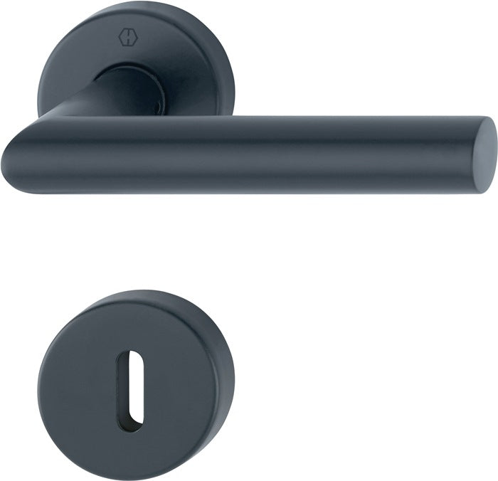 avec rosaces à clé pour portes intérieures - testé selon DIN EN 1906 : 37-0140A, garniture pour objet - F9714M noir mat, carré : 8 mm, avec douille à emboîter/réduire 8/8,5 mm - TS = 37 - 42 mm Logement : poignées de porte en vrac, ressorts de rappel utilisables à droite/à gauche, paliers lisses sans entretien Assemblage : Goupille rapide HOPPE avec goupille pleine HOPPE (partie goupille/partie trou) Sous-construction : plastique, cames d'appui Fixation : invisible, traversante, alternée, vis à usages multiples