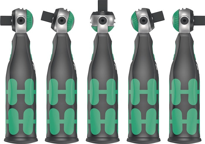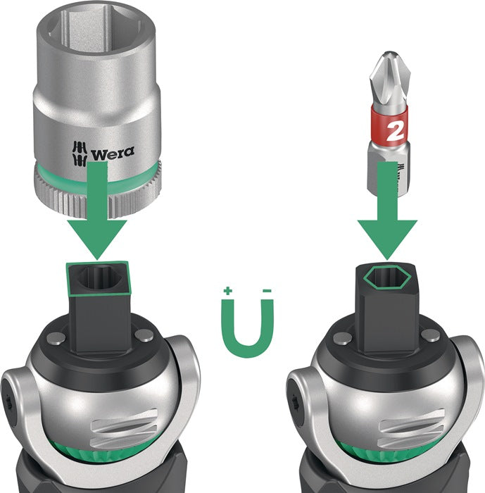 avec cliquet pivotant et réversible 8009 Zyklop - avec logement d'outil combiné adapté aux douilles à emmanchement carré de 10,0 mm (3/8″) et aux embouts à emmanchement hexagonal de 6,3 mm (1/4″) (C 6,3 et E 6,3) - manche Kraftform à plusieurs composants - intégré dans le manche, magasin imperdable et librement orientable avec 12 embouts - tête de cliquet librement orientable (position définie à 0°, 15° et 90° vers la gauche et la droite) - utilisable en position 0° comme un tournevis conventionnel - commutation gauche/droite - prise directe magnétique