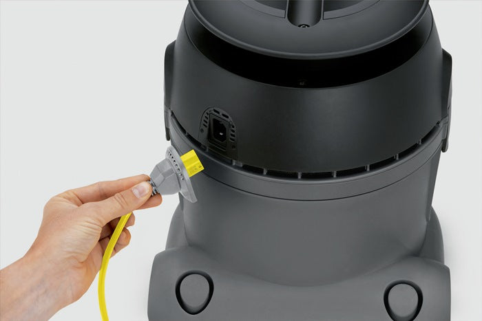 Description du produit : Appareil professionnel pour le nettoyage des bâtiments · régulation continue de la puissance d'aspiration · filtre principal permanent garantissant une aspiration sans sac filtrant · butée périphérique · câble d'alimentation enfichable avec fiche jaune · rangement du câble sur la tête de l'appareil