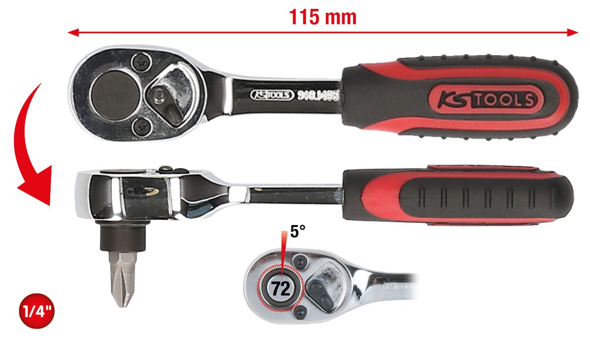 KS TOOLS 1/4' Cliquet réversible porte-embouts CHROMEplus, 72 dents, 115mm ( 918.1495 )