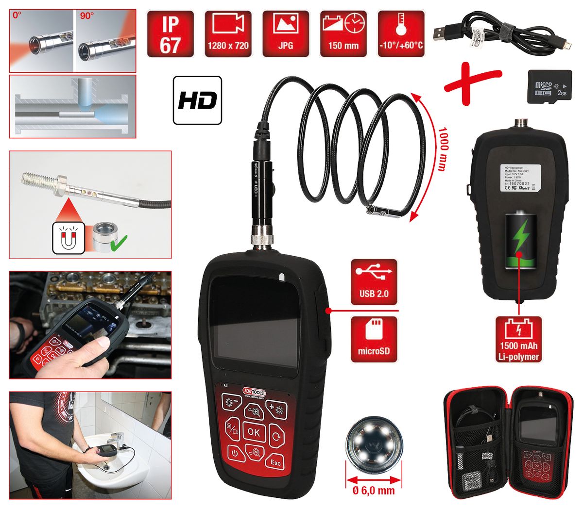 KS TOOLS Kit vidéoscope HD avec sonde de caméra HD avant Ø 6,0 mm 0° et 90°, commutable, 5 pcs ( 550.7500 )
