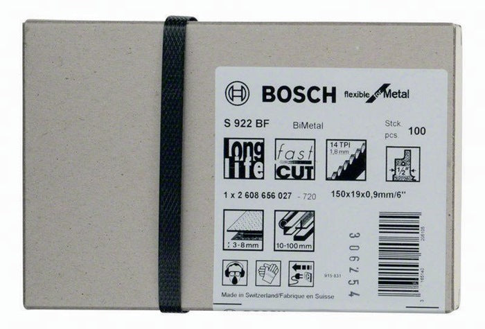 Lame de scie sabre S 922 BF. Flexible for Metal (flexible pour le métal). Matériau : BIM. Type de denture : avoyée - fraisée. Domaines d'utilisation : Pour tôles fortes (de 3 à 8 mm d'épaisseur) - Pour tubes/profilés massifs (avec un diamètre inférieur à 100 mm). Coupe rapide. Contenu de l'emballage de vente : 100 pièces.
