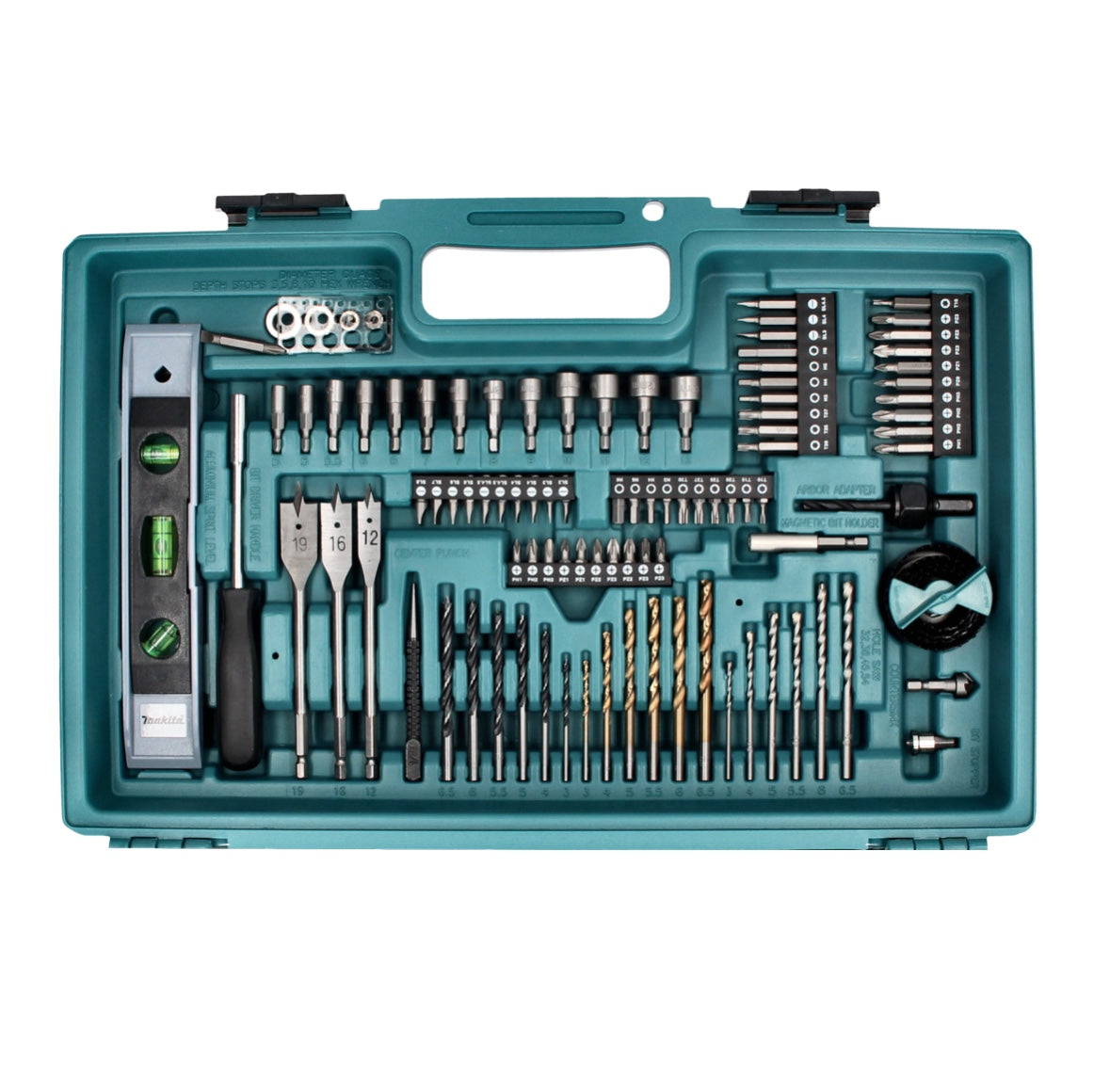 Makita Coffret d'Embouts, Forets, Niveau à bulle, Scie cloche, pour visseuse à percussion sans fil DTD et perceuse-visseuse à percussion DHP 102 pcs.