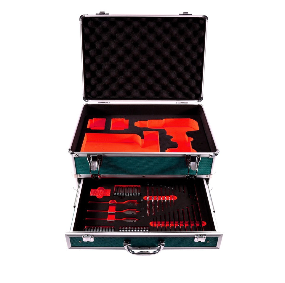 La perceuse à percussion Makita DHP 485 avec engrenage planétaire entièrement métallique à 2 vitesses dispose d'un mécanisme d'impact commutable. Le moteur sans balais intégré assure plus d'endurance, une durée de vie plus longue et un design plus compact. Avec LED lumineuse. De plus, cette perceuse à percussion est particulièrement maniable grâce à sa conception compacte et courte et permet de travailler dans des endroits difficiles d'accès. Le DHP 485 dispose d'un total de 21 réglages de couple et peut donc être réglé de manière très sensible. La perceuse à percussion est équipée d'une protection contre les décharges profondes qui éteint l'appareil dès que la batterie est presque vide. Makita est l'un des principaux fabricants d'outils électriques et se caractérise par sa qualité et sa fiabilité. La mallette à outils en aluminium Toolbrothers TX offre suffisamment d'espace pour une machine (par exemple une perceuse à percussion ou une clé à chocs), un chargeur et jusqu'à deux batteries. Le jeu d'embouts et de forets de 70 pièces dans le tiroir couvre toutes les applications. Il existe de nombreuses variétés d'embouts, de fraises, de clés à douille et de forets. Qu'il s'agisse de bois, de métal ou de pierre, la mallette contient une variété de forets dans les tailles les plus courantes. La bonne finition du boîtier promet une longue durée de vie et est également très agréable à regarder. La poignée de transport caoutchoutée est douce pour la paume des mains et peut également être facilement utilisée avec des gants. Les fermoirs métalliques du boîtier sont robustes et durables. Les inserts dans le fond et le couvercle assurent un transport sûr des machines dans la mallette. Avec la mallette en aluminium TX, les outils de travail et les accessoires correspondants peuvent être rangés en toute sécurité dans une seule mallette.