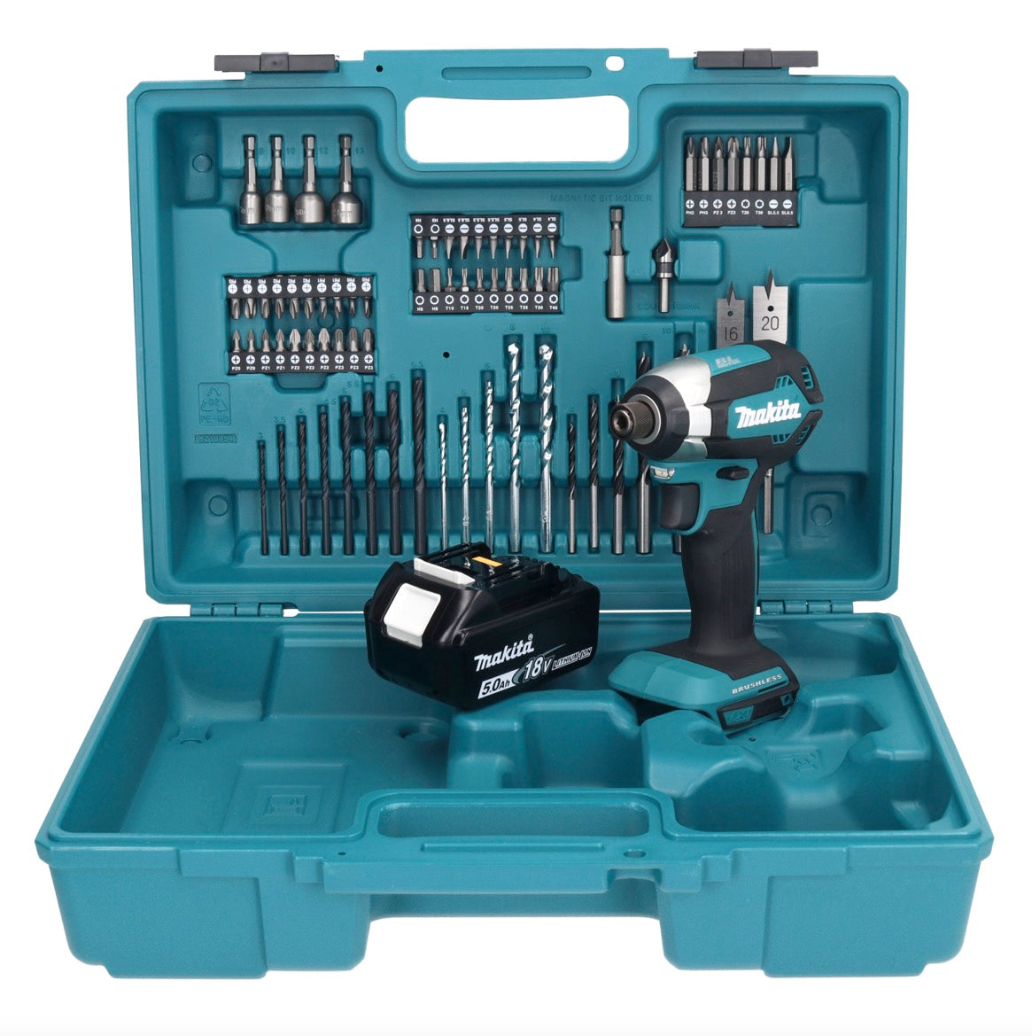 Makita DTD 153 T1X1 clé à chocs sans fil 18 V 170 Nm 1/4" sans balais + 1x batterie 5,0 Ah + jeu d'accessoires 74 pièces + mallette - sans chargeur
