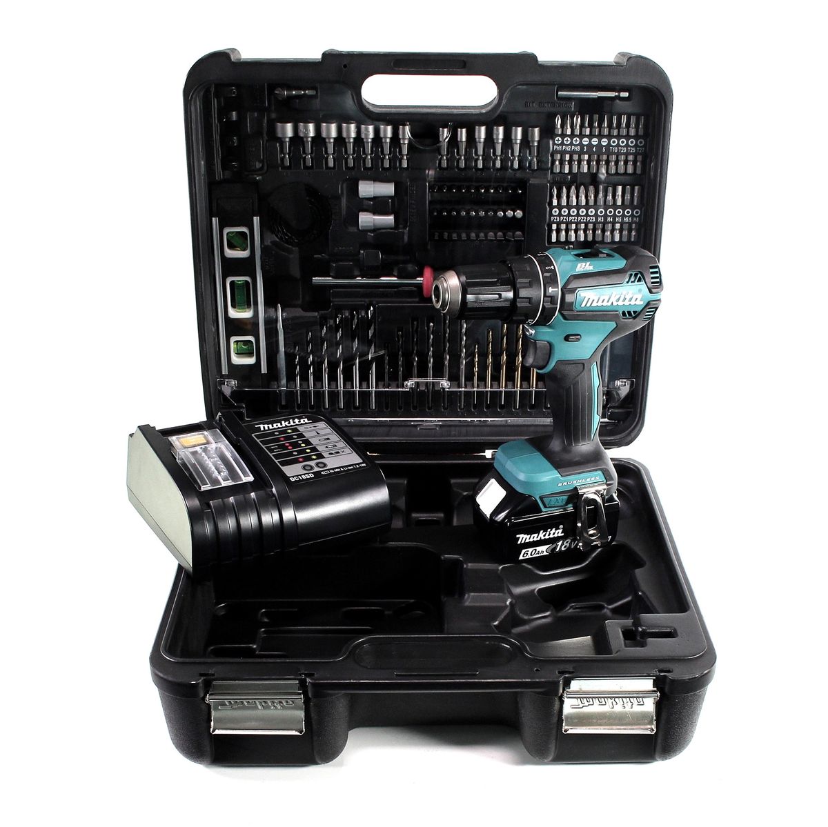 La clé à chocs sans fil est destinée à enfoncer des vis dans le bois, le métal et le plastique. La clé à chocs impressionne par son design ergonomique et compact. Le porte-outil à six pans creux 1/4" permet de changer rapidement et facilement différents accessoires. L'outil s'éteint automatiquement pendant le fonctionnement si l'outil et/ou la batterie sont surchargés ou si la capacité restante de la batterie est faible. Cela aide la batterie à prolonger La poignée ergonomique avec revêtement souple assure un grand confort lors du travail avec cet outil électrique. Le carter d'engrenage en aluminium avec couche de protection rend la clé à chocs robuste et assure une résistance maximale. La rotation gauche/droite est facile. Utilisation Interrupteur coulissant intégré dans la poignée. Le double éclairage LED puissant facilite le travail dans les zones moins éclairées. Avec la mallette à outils de 101 pièces de la marque de qualité Makita, tout ce dont vous avez besoin pour un usage professionnel ou privé est rapidement à portée de main. , un chargeur et un espace machine. La mallette est robuste, verrouillable et facile à transporter grâce à la poignée. Pas de recherche fastidieuse dans de nombreux endroits, avec la mallette Makita , tout est au même endroit.