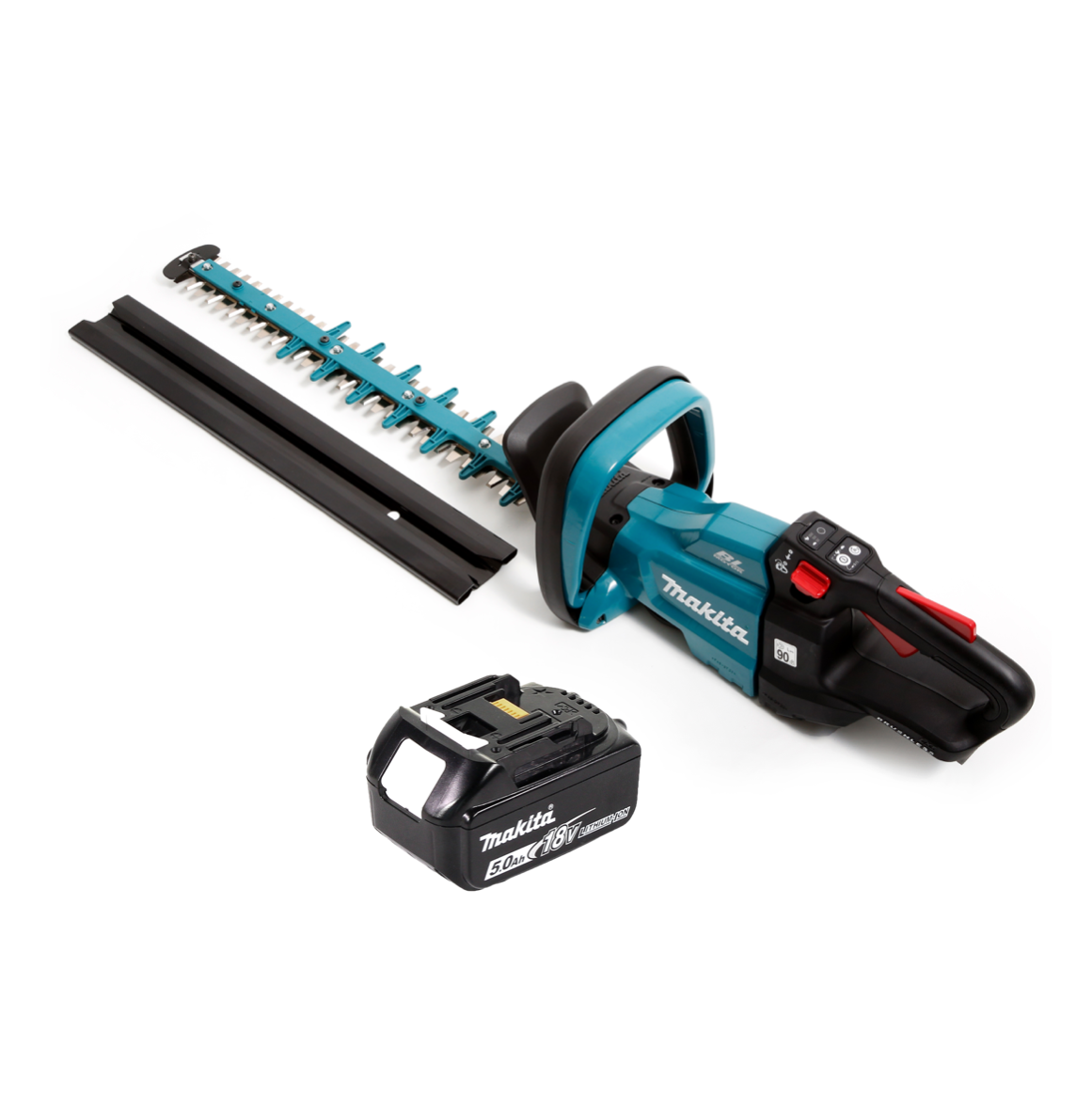 Le taille-haie sans fil Makita DUH 502 Z se compose d'une poignée à 5 positions. Verrouillage à 0°, 45° et 90° à gauche et à droite pour un travail confortable dans n'importe quelle position. Il est puissant, efficace et bien équilibré en plaçant la batterie à l'extrémité arrière de la poignée. Grâce à son faible poids, travailler avec le DUH 502 permet d'économiser de l'énergie. Avec un nombre de coups électronique réglable, il fonctionne en 3 étapes. Le taille-haie contient également un moteur sans balais pour plus d'endurance, une durée de vie plus longue et une conception plus compacte. Pour un démarrage plus rapide, le DUH 502 fonctionne avec des piles rechargeables. Inclus avec le taille-haie DUH 502 est 1x la batterie Li-Ion Makita BL 1850 B 18 V 5,0 Ah. La batterie Makita BL 1850 B convainc par sa longue durée de travail. Un avantage supplémentaire est le temps de charge court de seulement 45 minutes dans le chargeur Makita. Grâce à une faible autodécharge et à une protection contre les courts-circuits, les surtensions et les surchauffes, la batterie a une durée de vie maximale. Le BL 1850 B dispose également d'un affichage de l'état de charge par LED pour vérifier l'énergie restante dans la batterie.