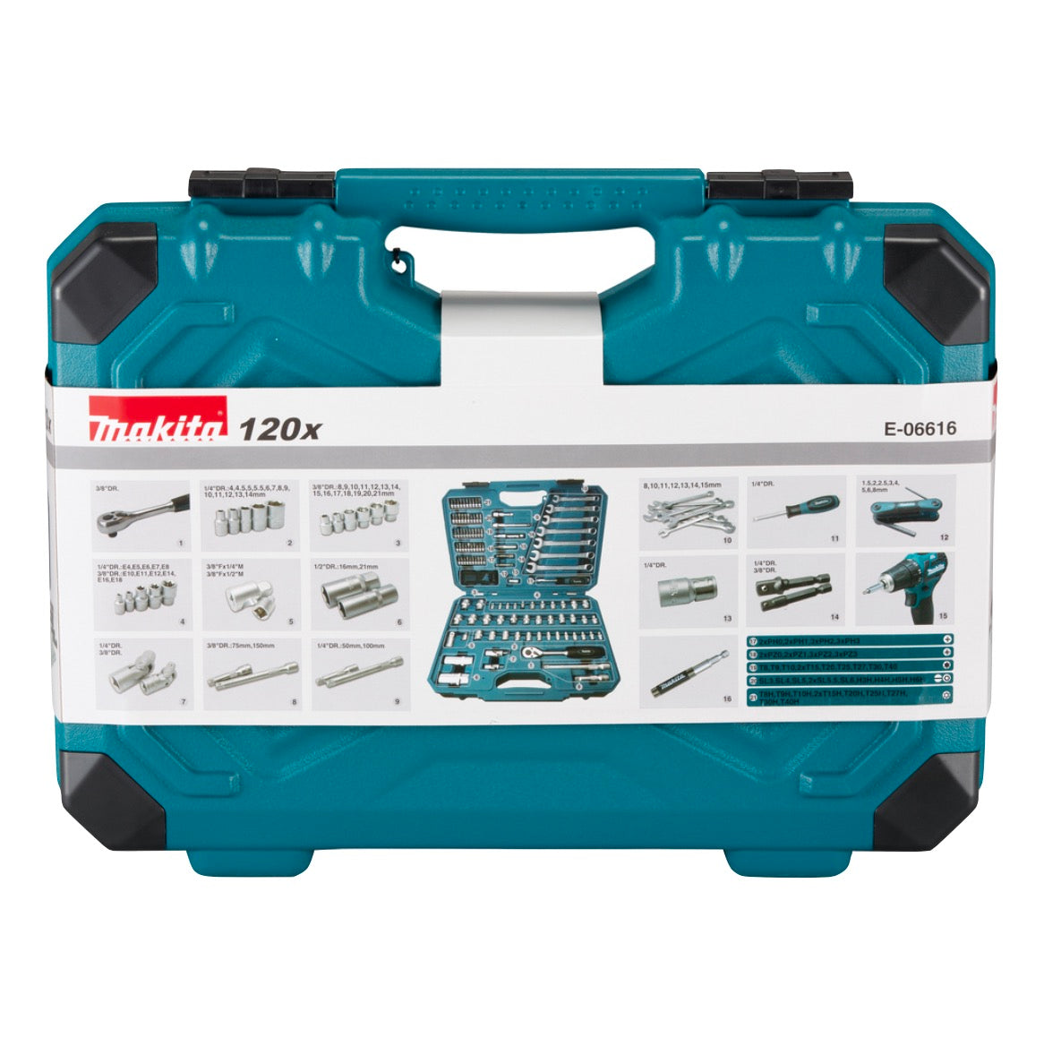 Makita Set d'outils 3/8'' 1/4'' 120 pces ( E-06616 ) Tournevis / Clé à cliquet / Clé à vis / Embouts + Coffret
