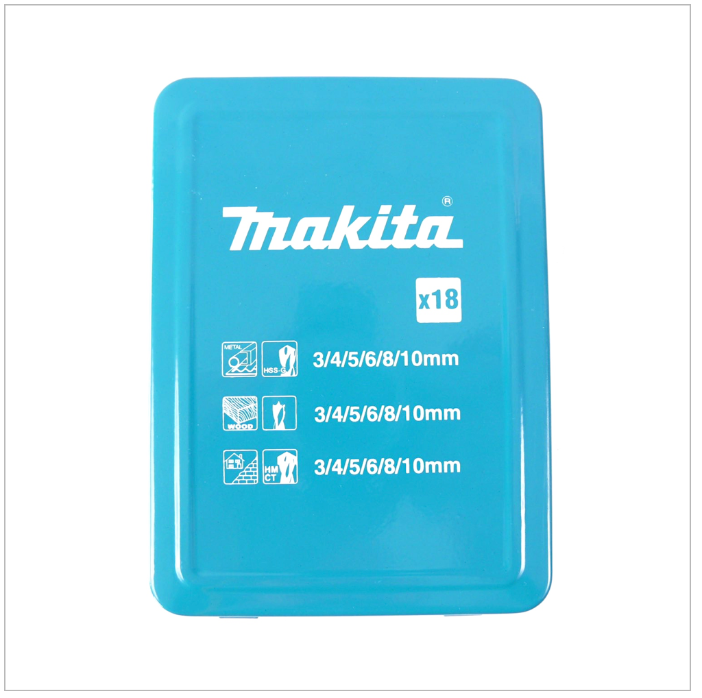 Ce set de forets de Makita contient 18 pièces de 6 tailles différentes, adaptées au perçage du bois, de l'acier et du béton. Il est livré dans un petit coffret métallique de Makita, avec un dispositif de fixation pour les différentes têtes de forets.