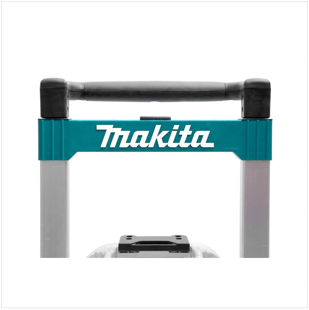 Le chariot-diable Makita se caractérise par une construction du châssis robuste et léger ainsi qu'une extension télescopique à hauteur réglable. La ceinture de sécurité peut être installée sans outils et peut-être réglés en hauteur. Le chariot Makita est équipé de poignées en caoutchouc et de roues à billes, ce qui rend le chariot particulièrement léger et facile à manipuler.
