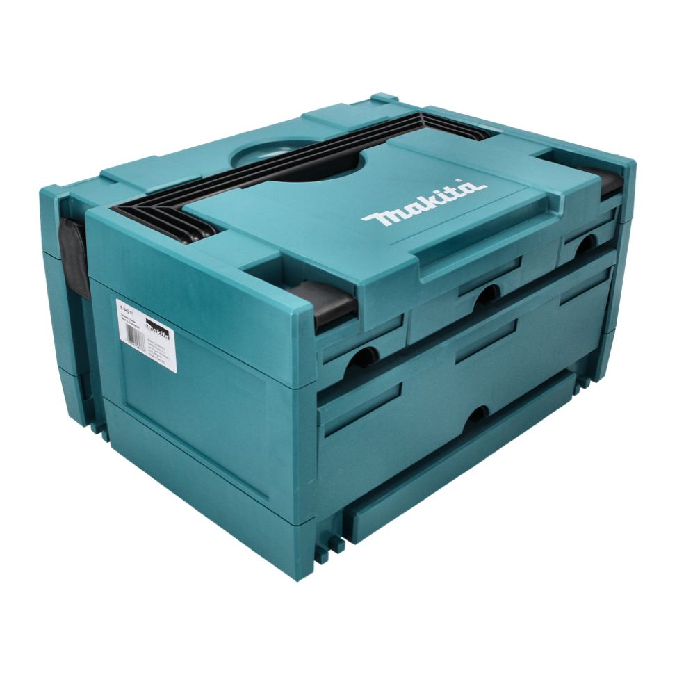 Les mallettes Makita MAKSTOR servent à ranger en toute sécurité les accessoires, les consommables et les petites pièces. Les tiroirs de la MAKSTOR s'enclenchent en toute sécurité, tandis qu'un dispositif de blocage de l'ouverture empêche la chute involontaire des tiroirs, même en cas de transport cahoteux. L'ouverture des tiroirs est possible grâce à un bouton-poussoir de grande taille. Pour retirer les tiroirs, il faut les faire basculer vers le haut. Pour un rangement parfait, les 4 tiroirs peuvent en outre être subdivisés grâce aux séparateurs fournis et étiquetés de l'extérieur. Bien entendu, les mallettes de la série MAKSTOR sont compatibles avec les mallettes système MAKPAC existantes. Makita est un fabricant leader d'outils électriques, une longue tradition et une grande qualité de fabrication caractérisent l'entreprise.