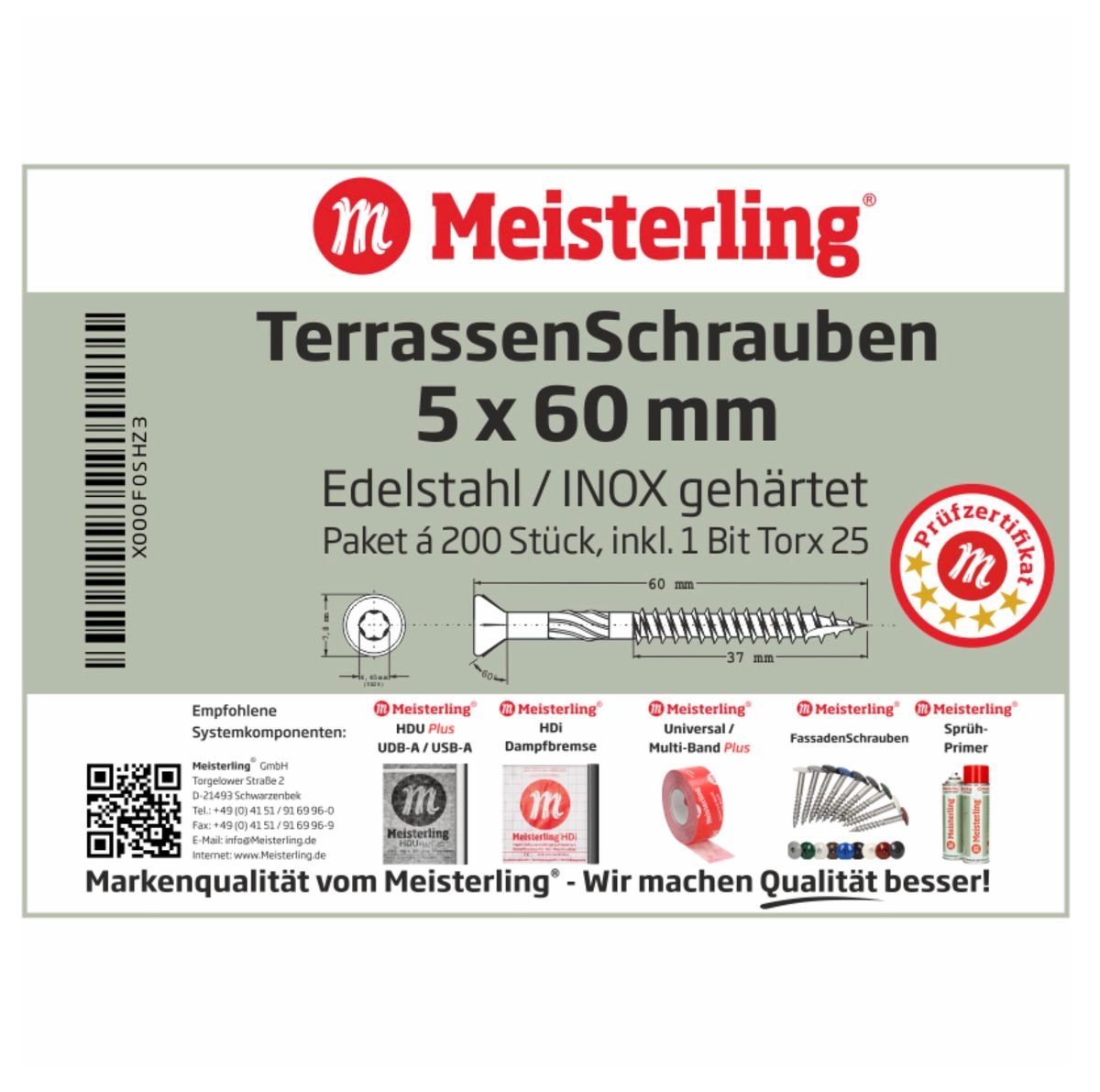 Meisterling Vis pour terrasse 90° 5x60 mm, 1200 pcs., tête fraisée, filetage Torx 2/3, acier inoxydable VA (6x 010010000021)