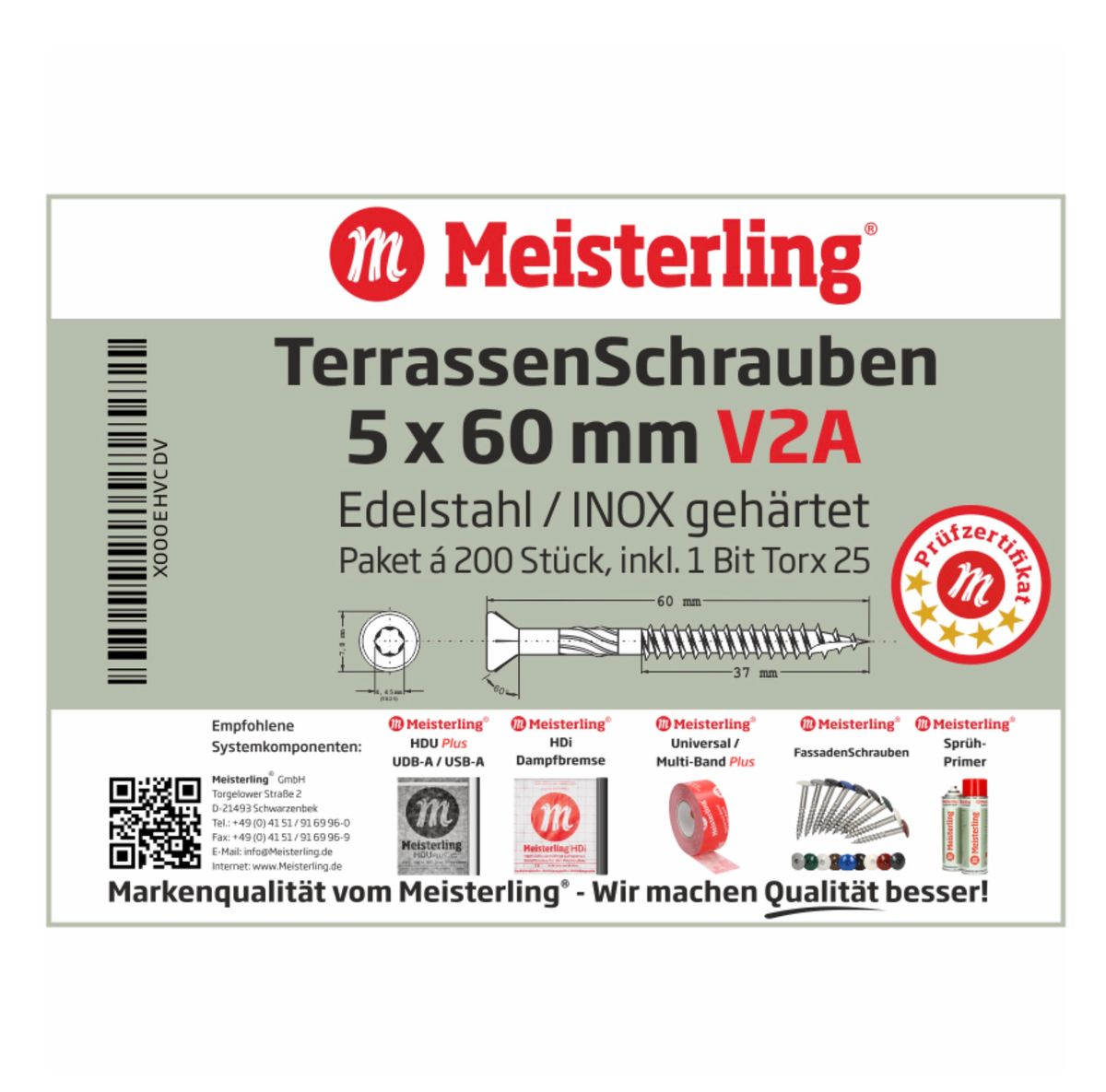 Les vis pour terrasse de la marque Meisterling disposent d'une pointe CUT, d'une rainure de coupe et d'ailettes de fraisage. Ces caractéristiques facilitent nettement le vissage de la vis de terrasse. Le filetage grossier s'étend au-dessus de 2/3 de la longueur de la vis et assure une connexion ordonnée ainsi qu'un maintien solide. Ces vis sont également dotée d'une tête fraisée à 90 °, ce qui garantit leur finition affleurante sur la pièce à usiner. Grâce à l'embout Torx de la vis (TX25), un maintien ferme est assuré lors du vissage sans glissement. Il s'agit en outre de vis universelles pour terrasses en bois, lames de terrasse, clôtures, revêtements en bois et façades sous-jacentes jusqu'à une hauteur de 8 mètres. Les bois de conifères comme par exemple le balau jaune (Bangkirai) sont idéaux, mais veuillez être prudent avec les bois exotiques, il faut prendre en compte le contenu du bois et le PH. Les vis pour terrasse du fabricant Meisterling sont en plus fabriquées en acier inoxydable V2A et sont trempées en inox, ce qui leur promet une grande stabilité et un maintien ferme sur la pièce à usiner. La haute qualité de fabrication de la marque Meisterling promet une longue durée de vie et beaucoup de plaisir avec une utilisation appropriée.