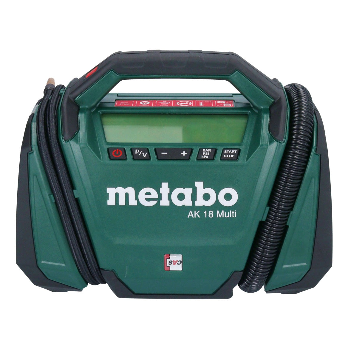 Le Metabo AK 18 Multi est un compresseur sans fil multifonctionnel qui peut être utilisé de manière polyvalente pour gonfler des pneus, des balles, des matelas pneumatiques et bien plus encore. Avec sa fonction haute pression, il permet de gonfler confortablement les pneus de voiture et de vélo. La fonction de volume du compresseur permet également de gonfler et de dégonfler rapidement les produits gonflables tels que les lits d'hôtes, les matelas pneumatiques et les accessoires de piscine. Un grand écran à fort contraste affiche la fonction sélectionnée, la pression actuelle et la pression cible réglée. La pression peut être affichée en bar, psi et kPa. Dès que la pression cible réglée est atteinte, le compresseur s'arrête automatiquement. Pour une utilisation dans l'obscurité ou par mauvaise visibilité, l'AK 18 Multi dispose d'une lumière LED claire qui éclaire la zone d'utilisation. Le compresseur peut être alimenté par des batteries de 18V, mais il est également possible de l'utiliser avec un câble de voiture de 12V. Un autre avantage de l'AK 18 Multi est qu'il peut être combiné avec tous les packs de batteries 18V et les chargeurs des marques CAS.