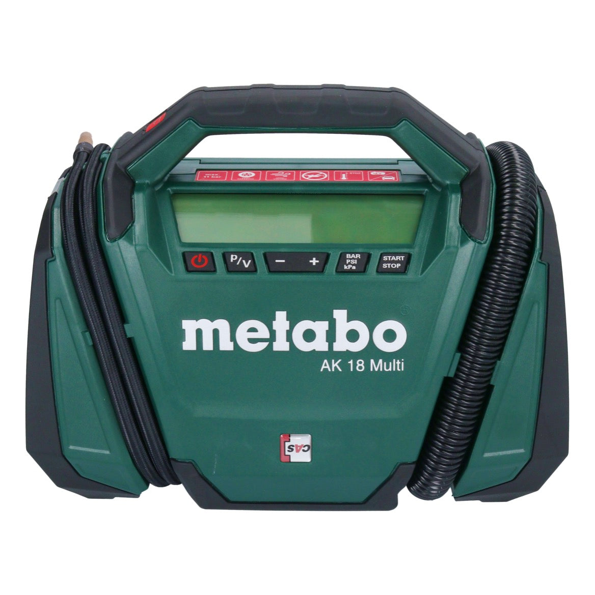 Le Metabo AK 18 Multi est un compresseur sans fil multifonctionnel qui peut être utilisé de manière polyvalente pour gonfler des pneus, des balles, des matelas pneumatiques et bien plus encore. Avec sa fonction haute pression, il permet de gonfler confortablement les pneus de voiture et de vélo. La fonction de volume du compresseur permet également de gonfler et de dégonfler rapidement les produits gonflables tels que les lits d'hôtes, les matelas pneumatiques et les accessoires de piscine. Un grand écran à fort contraste affiche la fonction sélectionnée, la pression actuelle et la pression cible réglée. La pression peut être affichée en bar, psi et kPa. Dès que la pression cible réglée est atteinte, le compresseur s'arrête automatiquement. Pour une utilisation dans l'obscurité ou par mauvaise visibilité, l'AK 18 Multi dispose d'une lumière LED claire qui éclaire la zone d'utilisation. Le compresseur peut être alimenté par des batteries de 18V, mais il est également possible de l'utiliser avec un câble de voiture de 12V. Un autre avantage de l'AK 18 Multi est qu'il peut être combiné avec tous les packs de batteries 18V et les chargeurs des marques CAS.