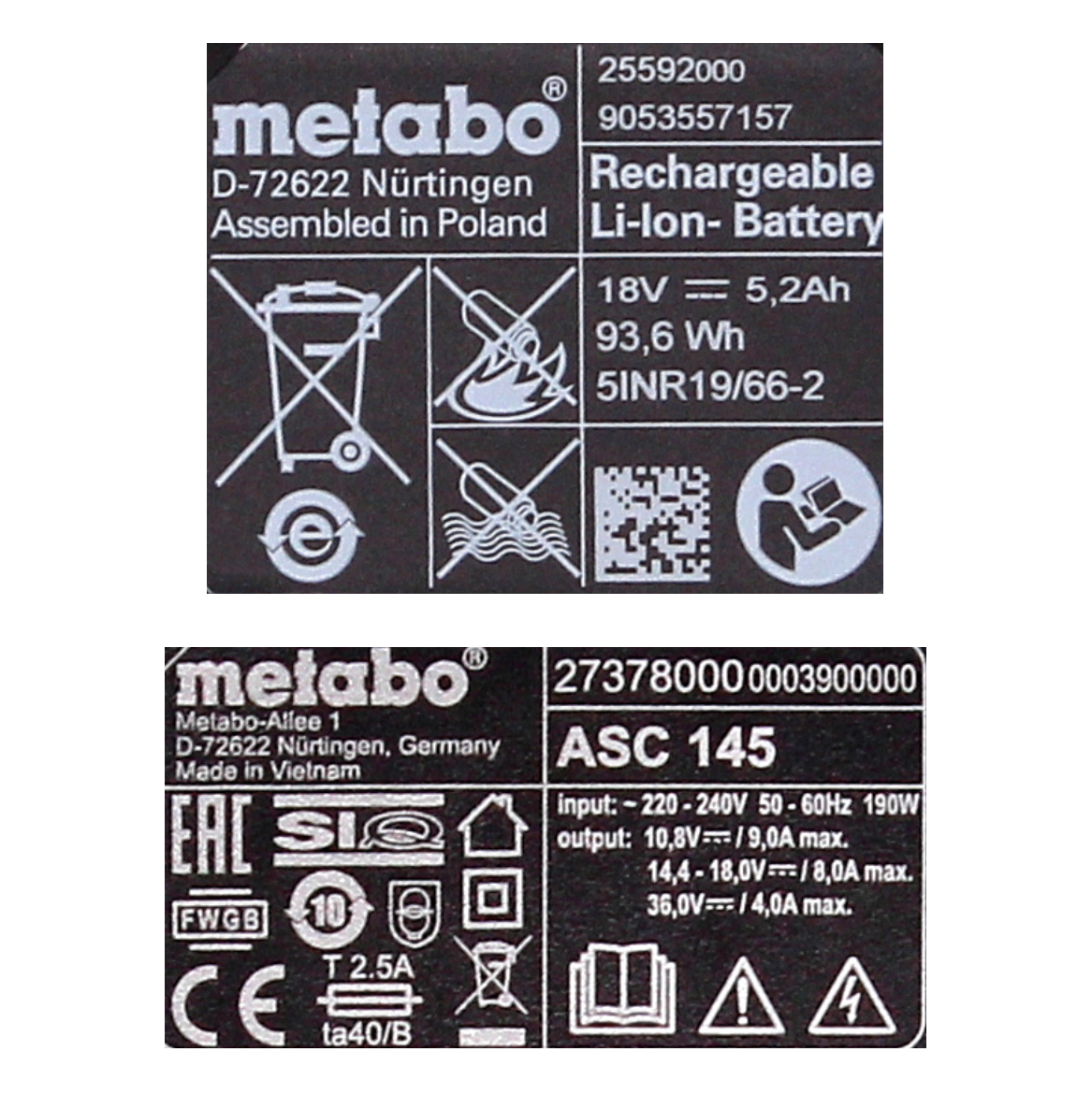 Les batteries sont impressionnantes par leur charge extrêmement efficace et douce, leur utilisation optimale de l'énergie et leur durée de vie extrêmement longue. La technologie Metabo Ultra-M est synonyme de coordination optimale et de communication parfaite entre le moteur de la machine, les batteries et le chargeur. Un système de surveillance multifonctionnel enregistre en continu à la fois la température et le courant de la batterie, et la surveillance électronique à cellule unique (ESCP) garantit une longue durée de vie des batteries. L'affichage de la capacité permet de vérifier en continu le niveau de remplissage. Les batteries peuvent être stockées pendant une longue période sans quasiment aucune décharge spontanée. Un avantage important pour les utilisateurs est la compatibilité illimitée. Depuis 2009, les batteries de chaque génération sont compatibles avec toutes les machines à batteries Metabo de la classe de tension correspondante et chaque chargeur Metabo charge toutes les batteries de la taille correspondante. Avec les batteries Metabo, vous serez également en sécurité à l'avenir. Le chargeur convient à la charge de toutes les batteries Li-Ion et LiHD à siège coulissant (12V-36V) avec un courant de charge de batterie adapté de Metabo. Le refroidissement breveté de la batterie AIR COOLED garantit des temps de charge considérablement réduits lors du chargement. L'ASC 145 impressionne avec une très faible puissance d'enregistrement en veille. La gestion intelligente de la charge contrôlée par le processeur garantit une charge douce et un nombre maximal de cycles de charge. La compatibilité à 100% avec toutes les machines 18 V, batteries et chargeurs des partenaires CAS (Cordless Alliance System): Rothenberger, Edding, Fischer, Mafell, Collomix, Eibenstock, Eisenblättert, Haaga, Starmix, Steine, Rokamat, Birchmeier fabrique les batteries et le chargeur à deux batteries et un chargeur pour tout. Le MetaLoc est une boîte extrêmement robuste et incassable avec une large poignée. Le système d'organisation bien pensé à l'intérieur de la boîte garantit que les bons accessoires sont toujours avec la bonne machine. Metabo propose des inserts spéciaux pour le stockage d'accessoires et de petites pièces. L'insert pratique offre de la place pour une machine BS / SB / SSD / SSW - tournevis sans fil Li / LT / LTX, pour un chargeur (SC / ASC / ULTRA) et pour deux batteries. Si nécessaire, trois batteries et un chargeur peuvent être rangés dans l'insert.