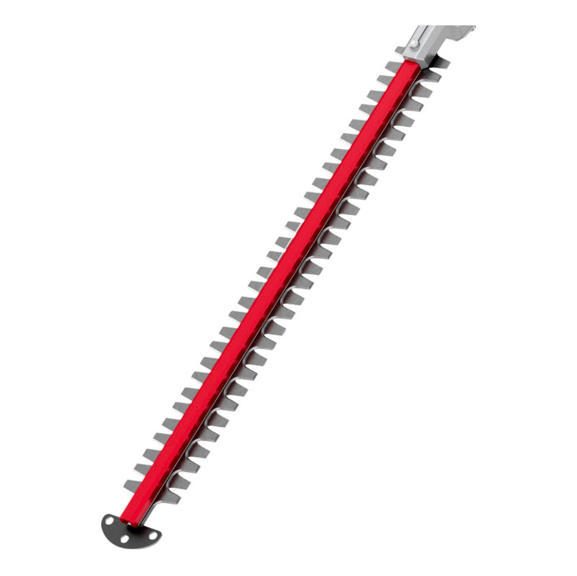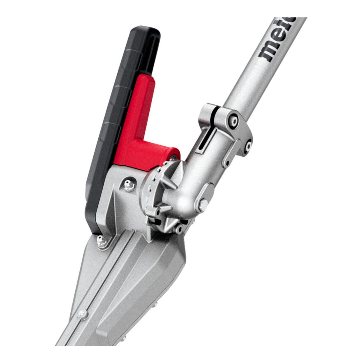 L'accessoire taille-haie offre un double système de coupe très efficace et précis avec des dents de couteau rectifiées au diamant et découpées au laser des deux côtés. Grâce au système de couplage Metabo Quick, l'accessoire peut être changé sans outils. La barre de coupe peut être pivotée sans outil de 215° en 13 étapes et permet ainsi l'angle optimal en fonction de la situation de travail. La protection contre les chocs protège les utilisateurs et les engrenages contre les rebonds lorsqu'ils travaillent à proximité des murs et des sols. Avec une longueur de lame de 50 cm, une longueur de coupe de 48 cm et une épaisseur de coupe maximale de 22 mm, le système est robuste à l'usage et est idéal pour tailler les haies hautes et les buissons. La barre de coupe pliée permet un transport facile et un stockage peu encombrant. Avec le système multifonction Metabo, vous obtenez un système silencieux et respectueux de l'environnement, idéal pour les zones sensibles au bruit.