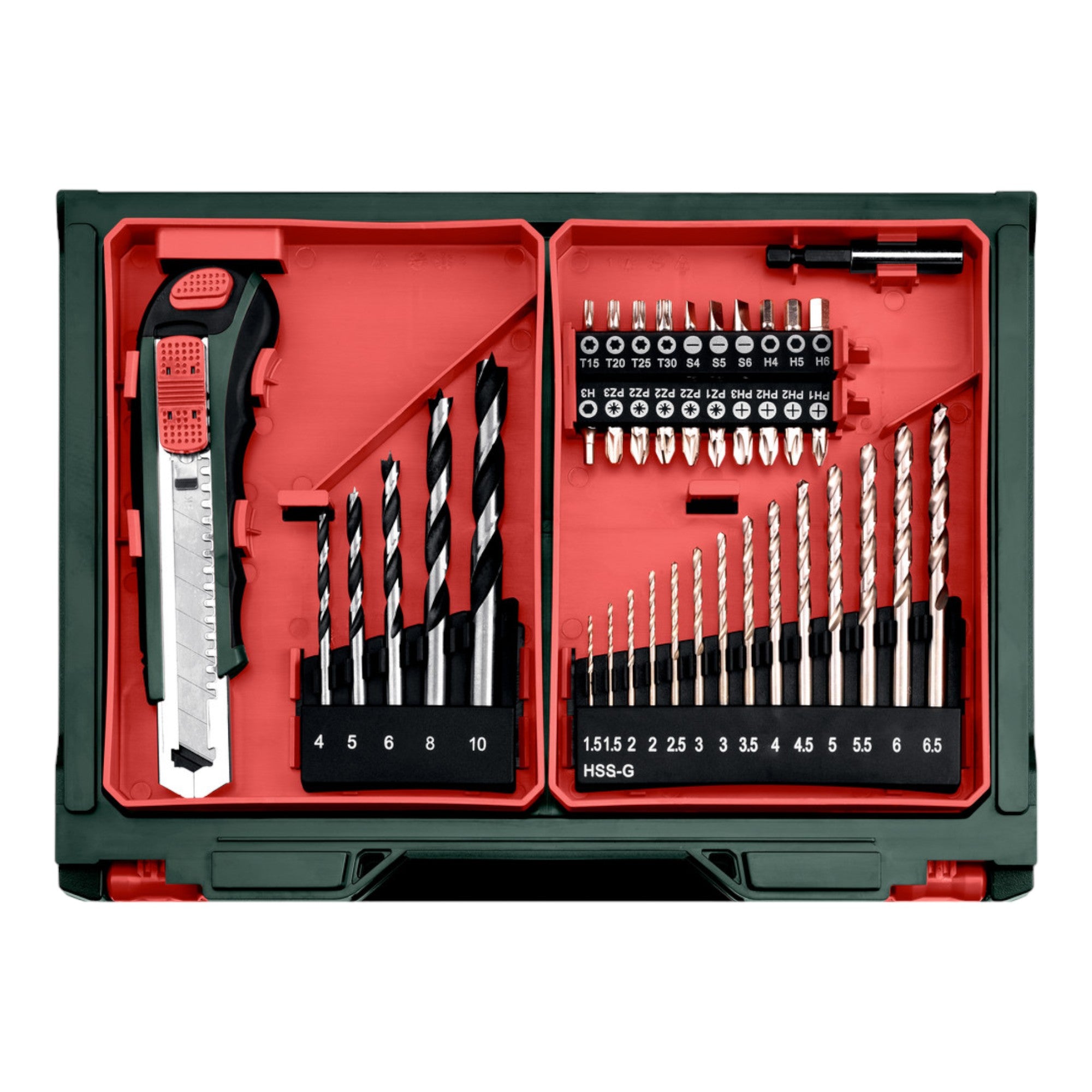 Metabo Powermaxx BS Basic Set Perceuse-visseuse sans fil 12 V 34 Nm ( 600080710 ) + 2x batterie 2,0 Ah + chargeur + 41 pcs. kit d'accessoires + coffret
