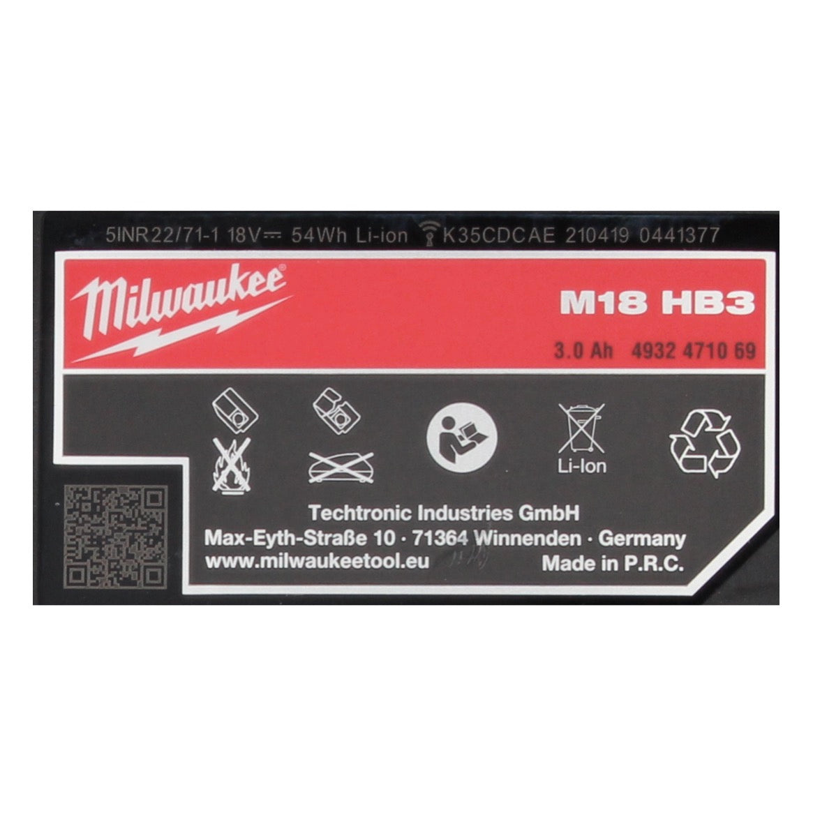 - 1x Batterie Li-Ion Milwaukee M18 HB3 High Output 18 V 3.0 Ah / 3000 mAh (4932471069) avec indicateur de niveau de charge