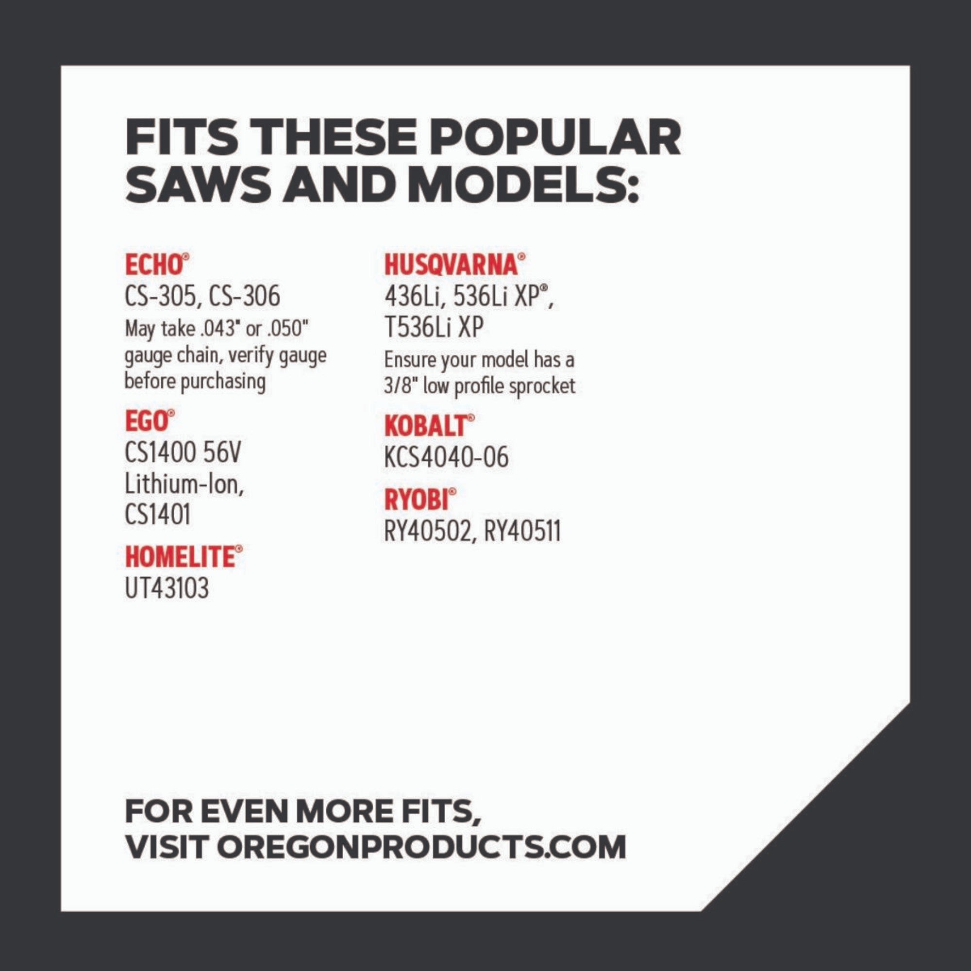 La chaîne Oregon 90PX est le choix parfait pour les petites tronçonneuses de faible puissance et offre une efficacité de chaîne impressionnante. Elle a été spécialement conçue pour les paysagistes et les propriétaires qui ont besoin d'une chaîne fiable et performante. Le design 3/8" Low Profile™ et le système de coupe étroit avec un trait de coupe de 1,1 mm (.043") permettent de réduire la consommation d'énergie et d'augmenter l'efficacité, car la chaîne utilise moins de courant de la tronçonneuse que les systèmes de coupe traditionnels. Avec 52 maillons d'entraînement et une puissance de sciage maximale de 42 cm³, la chaîne est parfaitement adaptée à une utilisation pour les petits travaux dans le jardin ou sur le terrain. LubriTec™ maintient la chaîne et le guide-chaîne toujours huilés, réduit les frottements et assure une plus grande longévité de la chaîne. Les indications de limage sur le dessus de la chaîne facilitent l'affûtage précis, de sorte que les performances de la scie restent à tout moment au plus haut niveau. Grâce à son faible rebond, la chaîne Oregon 90PX offre un niveau de sécurité élevé, en particulier pour les utilisateurs qui effectuent régulièrement de petites coupes. Utilise toujours cette chaîne avec des guides qui supportent un trait de coupe étroit afin de garantir les meilleures performances et la sécurité.