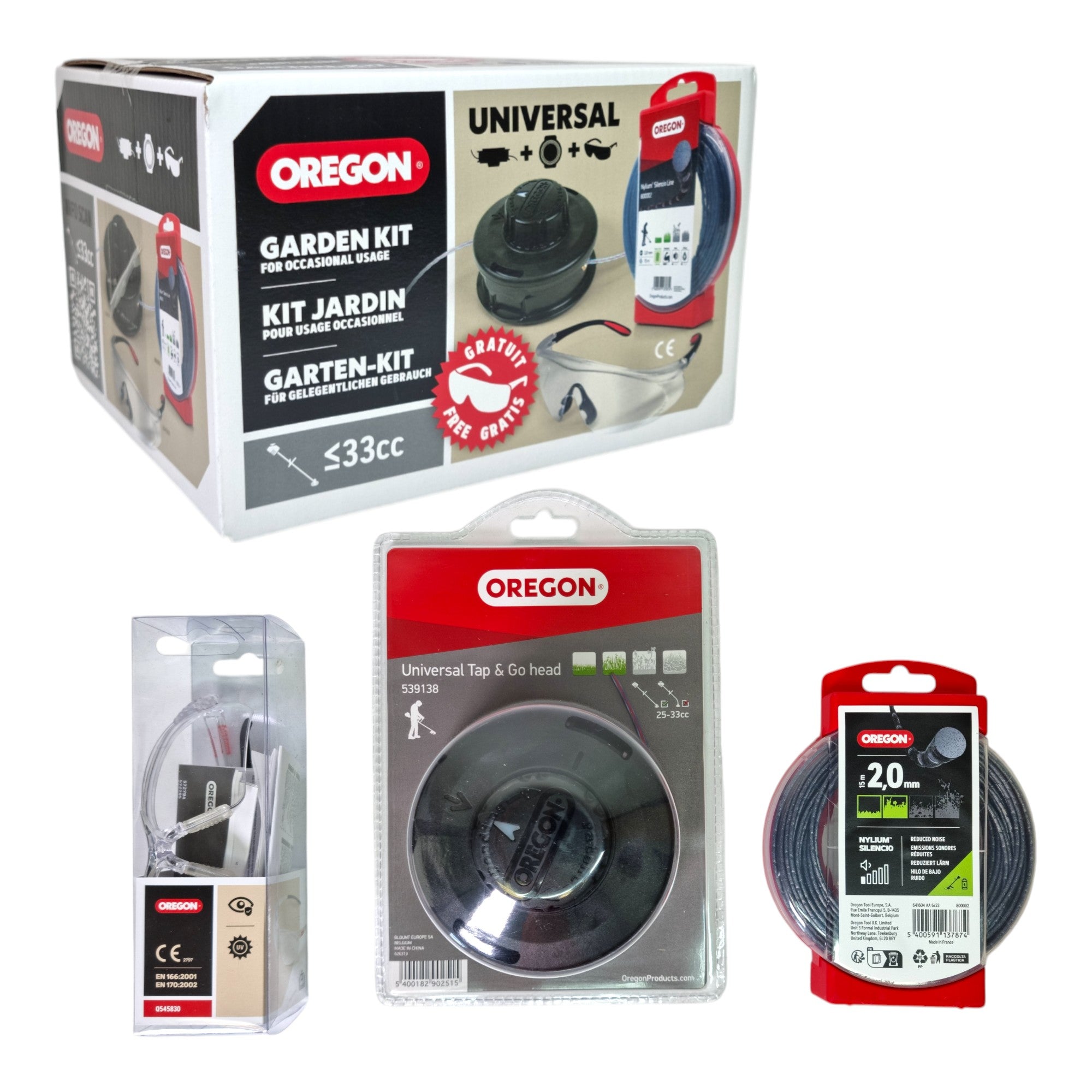Le kit de jardinage Oregon offre tout ce dont vous avez besoin pour les travaux de jardinage exigeants. La tête à fil de la marque Lightning Load™ est équipée de fils de coupe de section ronde, étoilée et carrée et s'adapte à la plupart des débroussailleuses. Il a été spécialement conçu pour une utilisation intensive sur les pelouses et pour l'élimination des mauvaises herbes. Avec sa grande capacité de charge et un montage simple ne nécessitant aucun démontage, la tête de coupe assure un travail efficace. De plus, les armatures de l'adaptateur réduisent considérablement les vibrations, tandis que le large rayon et la grande surface du bouton permettent d'avancer rapidement et en douceur. Le fil de coupe Oregon® TerraMax™ a été spécialement conçu pour être utilisé sur des terrains accidentés, secs et rocheux et est idéal pour les professionnels. Fabriqué à partir d'un mélange de copolymères de haute qualité, le fil offre une résistance et une rigidité supplémentaires pour obtenir un excellent résultat, même dans des conditions difficiles. Le kit est complété par des lunettes de protection ergonomiques qui peuvent être portées par-dessus des lunettes. Elles offrent une protection contre les chocs et les UV tout en combinant un grand confort et une durabilité supérieure, de sorte que vous êtes toujours bien protégé, même lors de travaux de longue durée.