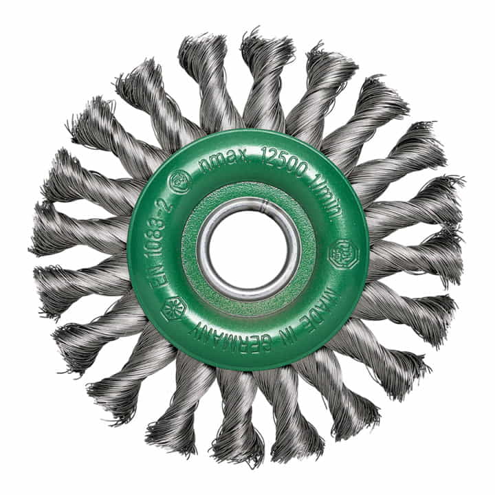 Brosse ronde torsadée de qualité industrielle pour une utilisation universelle sur toutes les meuleuses d'angle courantes - nettoyage agressif et rapide - toutes les pointes métalliques sont utilisées simultanément - longue durée de vie - certifiée TÜV-Süd (sécurité contrôlée - production surveillée) - pour le dépolissage, l'ébavurage et les travaux simples d'élimination de la rouille acier, inox - alésage 22,2 mm Ø
