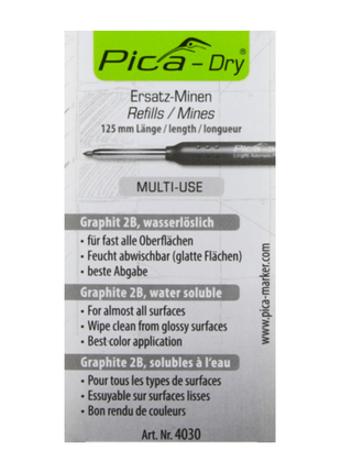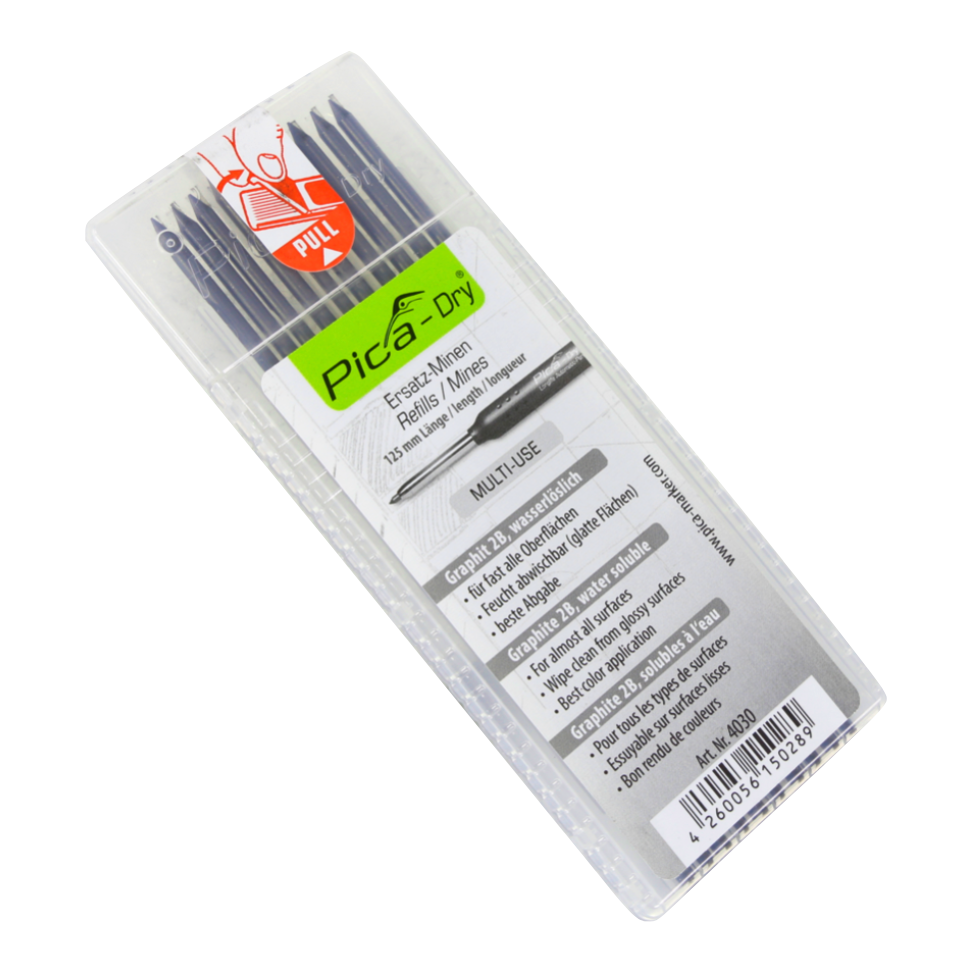 Ces mines en graphite de Pica Dry conviennent à presque toutes les surfaces: humide ou sèche, lisse, rugueuse, poussiéreuse, huileuse, claire ou sombre. Les marques peuvent être effacées des surfaces lisses à l'aide d'un chiffon humide. Ces mines sont livrées déjà affûtées et sont rangées dans une boîte en plastique Pica Dry très pratique.