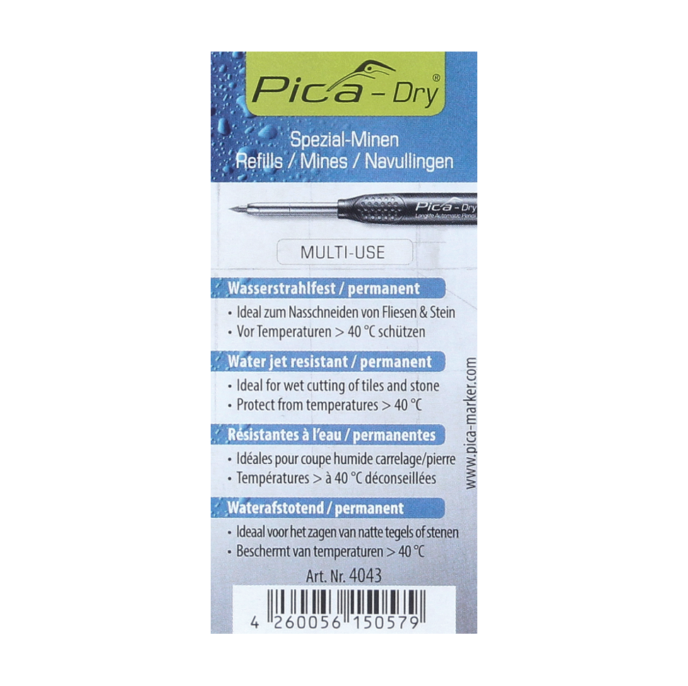 Les mines spéciales Pica Dry conviennent à une utilisation sur presque toutes les surfaces, qu'elles soient lisses ou rugueuses, sèches ou humides, poussiéreuses ou huileuses. Les fils résistants au jet d'eau sont particulièrement adaptés au marquage lors de la coupe à l'eau de carreaux et de pierres. Les mines spéciales Pica Dry sont sans chlorure.
