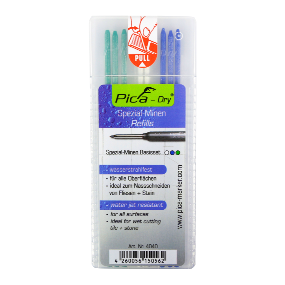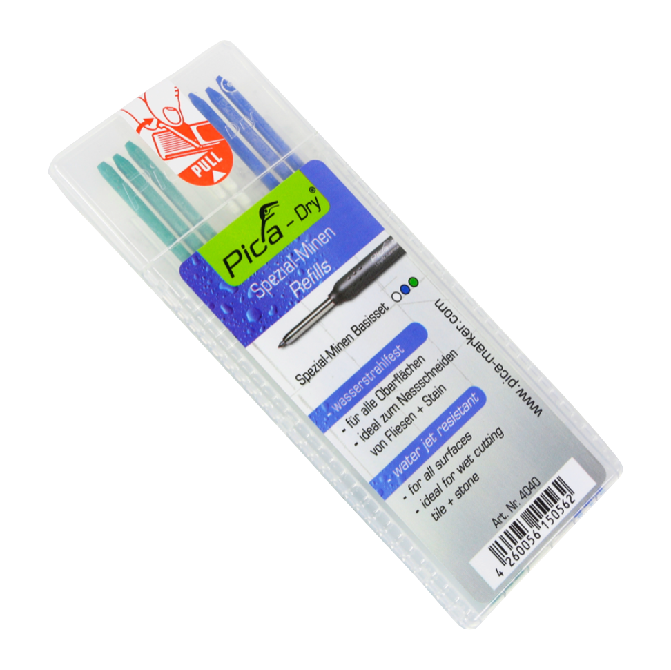 Ces mines spéciales de rechanges de Pica Dry conviennent pour presque toutes les surfaces, qu'elles soient lisses ou rugueuses, sèches ou humides, poussiéreuses ou huileuses. Elles sont particulièrement adaptées à la coupe humide des carreaux et des pierres. Ces mines spéciales Pica Dry sont sans chlorure.