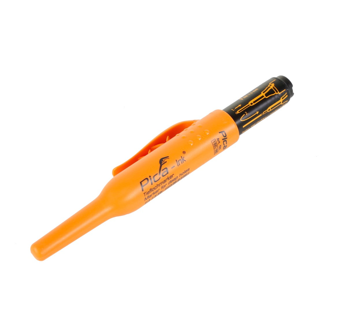 Le marqueur noir à trous profonds INK de Pica est idéal pour les zones difficile d'accès. Il est imperméable sur presque toutes les surfaces sèches. Son protège-carquois pratique est doté d'un clip spécial pour une utilisation parfaite d'une seule main. L'encre permanente à base d'alcool est très facile à enlever des surfaces lisses avec de l'alcool et il peut néanmoins être conservée ouverte pendant 24 heures. Sa pointe télescopique en acier inoxydable, brevetée et auto-ajustable, garantit une performance d'écriture jusqu'à 3 fois supérieure en utilisant pleinement la longueur d'abrasion de 7 mm de la pointe en fibre au lieu de 2 mm. Son embout peut être tourné de 180° plusieurs fois et assure ainsi une "deuxième, troisième, ... vie". Pour ce faire, il suffit de repousser l'embout télescopique à l'aide d'une pince, de retirer la mèche de l'embout et de la faire pivoter de 180°, puis de la réinsérer et de pousser à nouveau l'embout télescopique vers l'avant.