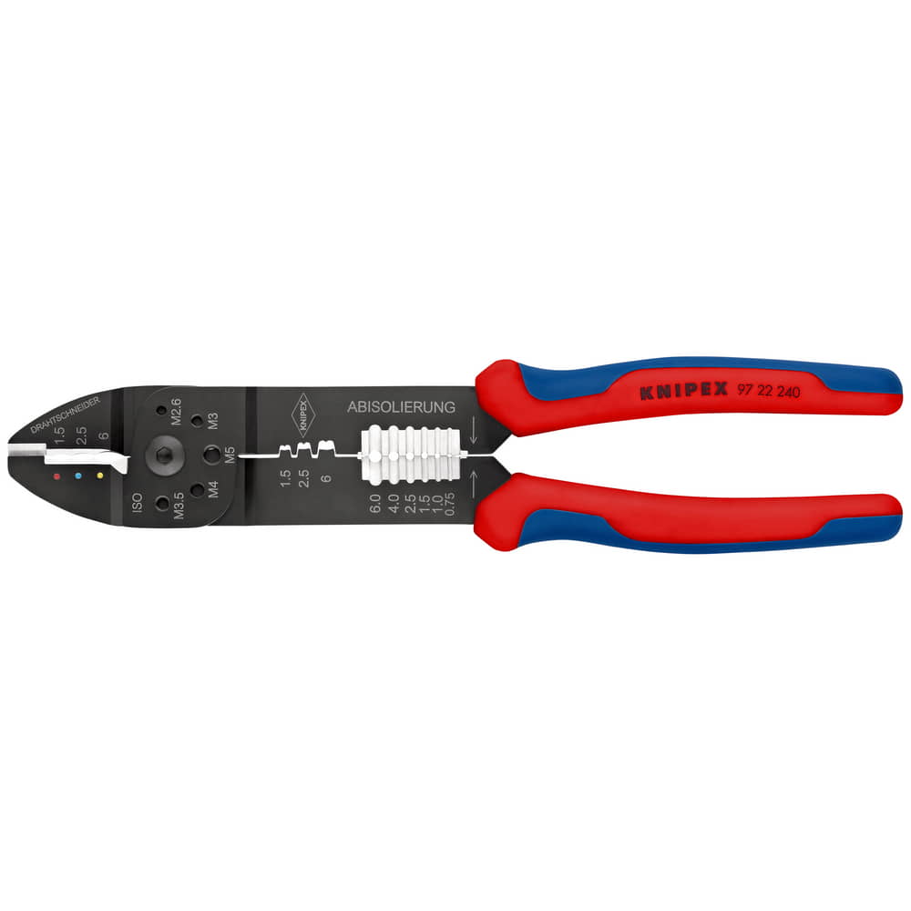 pour couper les câbles, dénuder les fils et écraser les cosses et connecteurs isolés et non isolés et les connecteurs à piquer ouverts - avec trous taraudés pour couper les tiges filetées Cu et Ms M 2,6 / 3 / 3,5 / 4 / 5 - en acier spécial à haute résistance pince laquée noir - avec gaines multi-composants