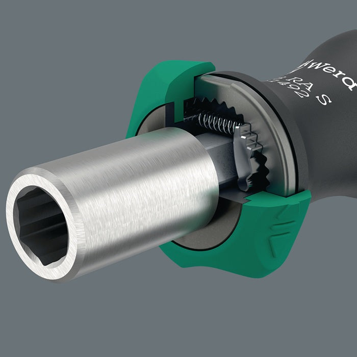 cliquet à fine denture intégré dans le manche - travail maniable et sans effort grâce au mécanisme à cliquet entièrement intégré dans le manche - commutation ergonomique en position droite/gauche ou 0 - porte-embouts magnétique pour embouts à emmanchement hexagonal 1/4 ʺ - manche Kraftform Plus pour un travail ergonomique évitant ampoules et durillons 4000828154 : avec porte-embouts magnétique 4000828155 : avec porte-embouts à serrage rapide Rapidaptor