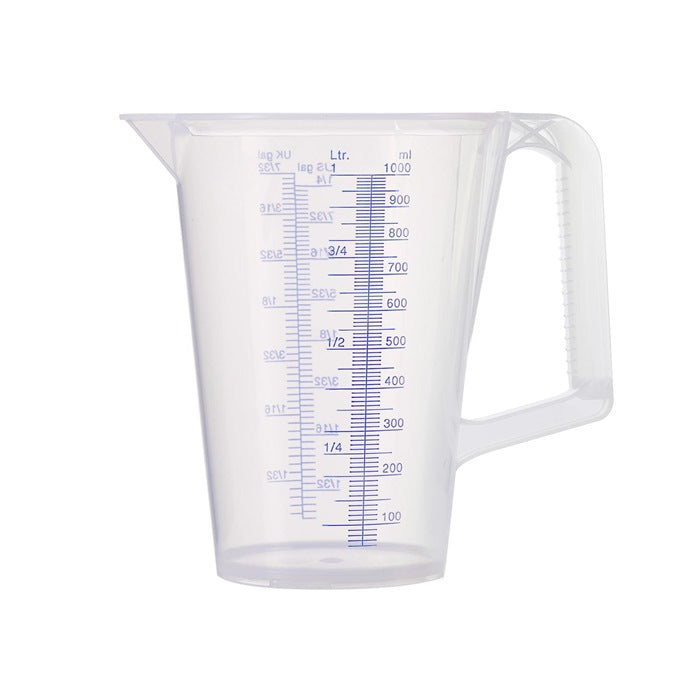 en polypropylène - sur chaque côté du gobelet gradué, une échelle imprimée en bleu en MI et GAL - poignée ergonomique avec rainures pour une meilleure prise en main - résistant aux produits neutres, aux huiles, aux acides et à l'alcool - sans BPA - convient pour les aliments conformément à (UE) N° 20/2011 et FDA § 21 CFR 177.1520
