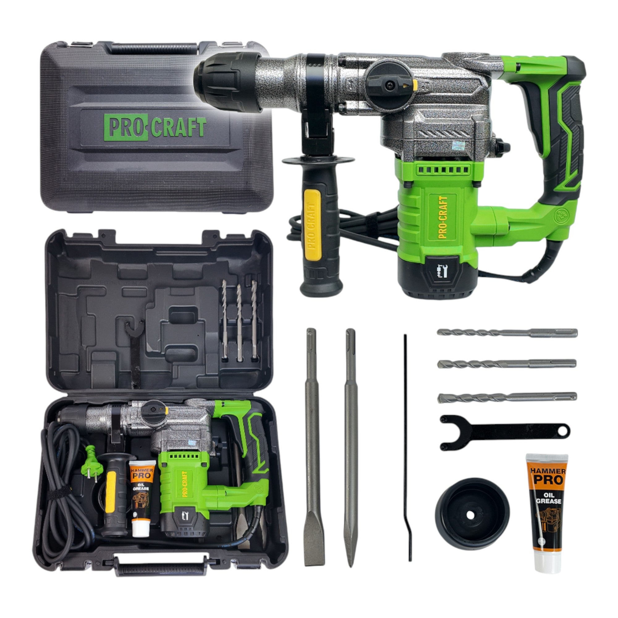 Der Procraft BH1300 Kombihammer eignet sich ideal für Arbeiten an Baustoffen wie Ziegel, Beton und Naturstein und bietet mit seinen drei umschaltbaren Funktionen – Bohren, Hammerbohren und Meißeln – eine hohe Einsatzvielfalt, während das Schnellspannfutter im SDS-Plus-System einen schnellen Werkzeugwechsel ermöglicht. Die Drehzahlregelung und der Rechts-/Linkslauf sorgen für flexible Anpassung an verschiedene Arbeitsanforderungen, und der D-förmige Handgriff schützt die Hand vor Verletzungen und bietet zugleich eine sichere, komfortable Führung des Geräts. Kompatibel mit SDS-Plus-Hammerbohrern, flachen, spitzen oder geformten Meißeln für Mauerwerk, Schneckenbohrern und Holzmeißeln ist der BH1300 ein zuverlässiger Begleiter für unterschiedlichste Bau- und Renovierungsaufgaben.