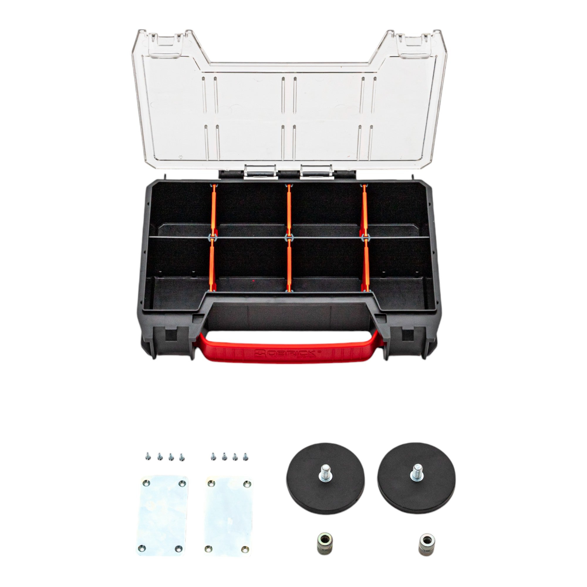 Le Qbrick System Custom Magnetic Set offre une solution innovante pour la fixation d'outils magnétiques, comme les marteaux, les clés, les niveaux ou les limes, sur les mallettes à outils. Les aimants caoutchoutés permettent de fixer les outils en toute sécurité et à portée de main. En outre, des plaques métalliques montables permettent de fixer magnétiquement des mallettes, comme par exemple la PRO Organizer Multi. Ce système est exclusivement compatible avec les systèmes Qbrick ONE 2.0, PRIME et PRO 2.0.