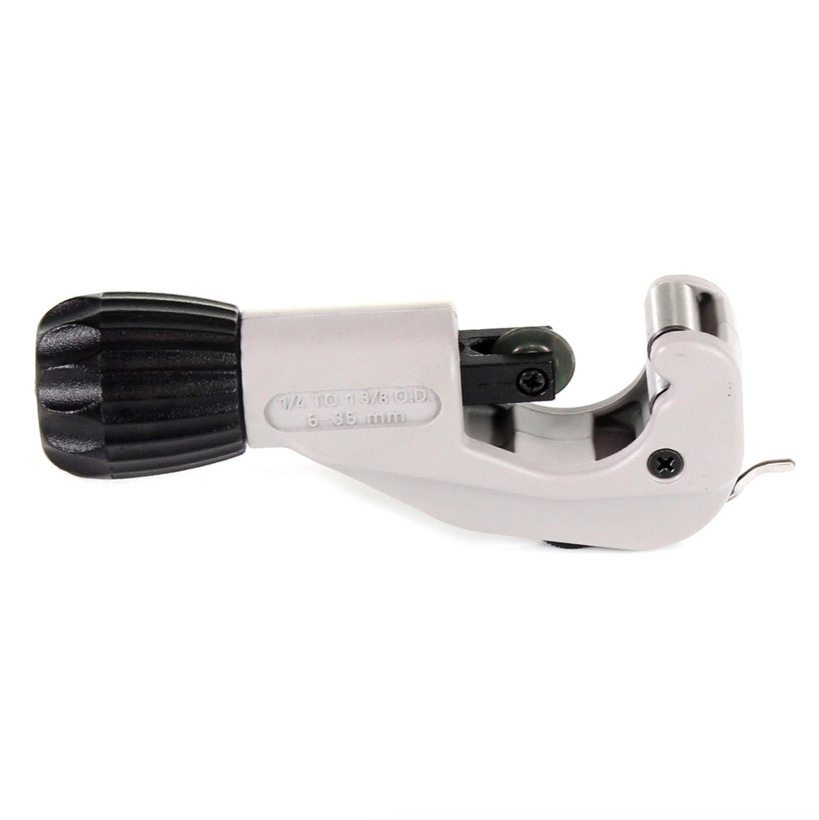 Le TUBE CUTTER 35 de Rothenberger est idéal pour couper facilement le cuivre, la laiton, l'aluminium et sans effort; il est aussi très indispensable pour préparer les raccords de tuyaux. De plus, on économise même du matériel, car l’enregistrement par rainure permet une coupe évasée. Vous êtes toujours prêt à passer à l'action grâce à la molette de rechange dans la poignée. La poignée est également facile: Il est ainsi possible de régler rapidement le rayon de travail. Ce coupe-tube contient deux dispositifs en un, car il contient un ébavureur à tube intérieur rétractable. Le corps en magnésium rend le coupe-tube léger et pourtant très robuste.