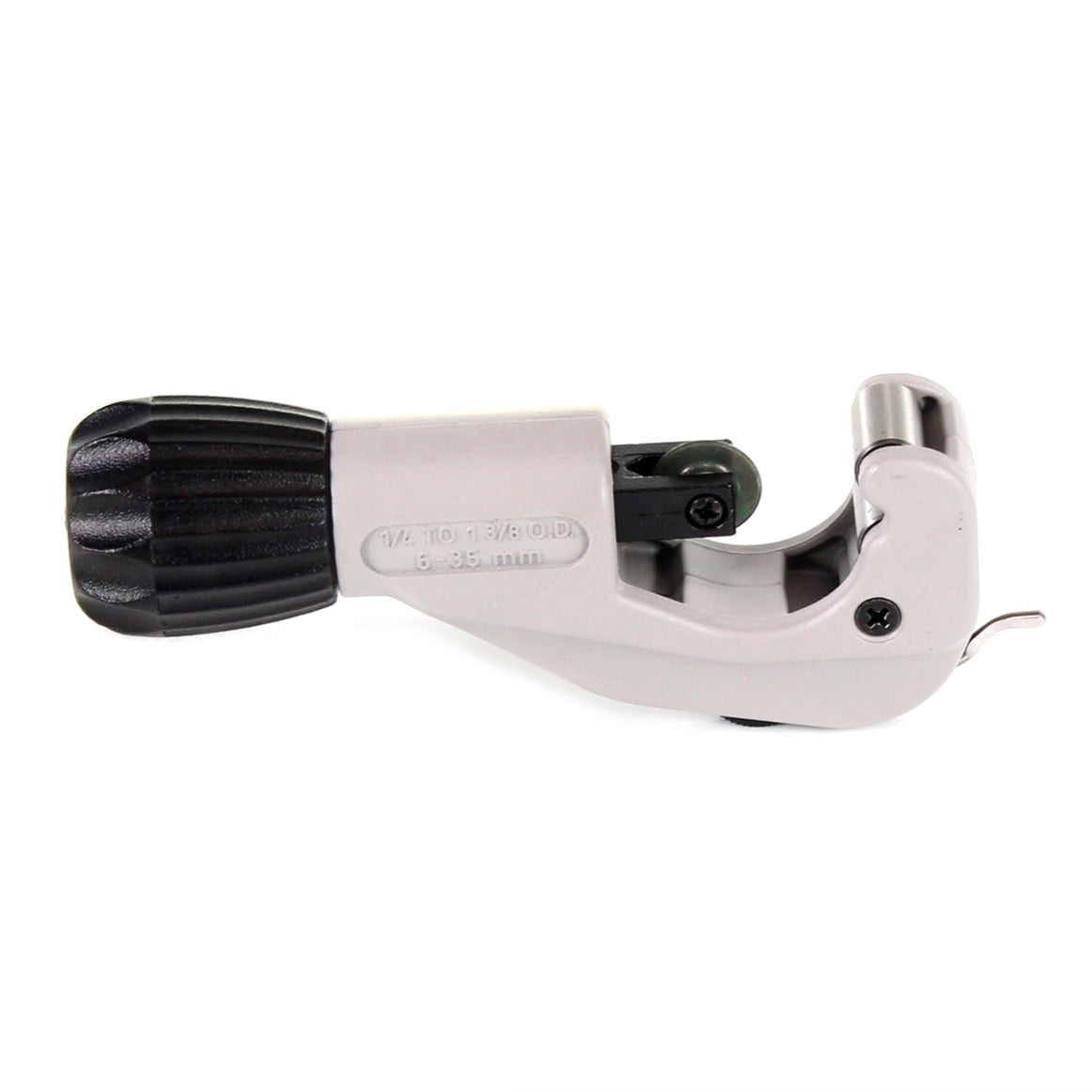 Le TUBE CUTTER 35 de Rothenberger est idéal pour couper facilement le cuivre, la laiton, l'aluminium et sans effort; il est aussi très indispensable pour préparer les raccords de tuyaux. De plus, on économise même du matériel, car l’enregistrement par rainure permet une coupe évasée. Vous êtes toujours prêt à passer à l'action grâce à la molette de rechange dans la poignée. La poignée est également facile: Il est ainsi possible de régler rapidement le rayon de travail. Ce coupe-tube contient deux dispositifs en un, car il contient un ébavureur à tube intérieur rétractable. Le corps en magnésium rend le coupe-tube léger et pourtant très robuste.