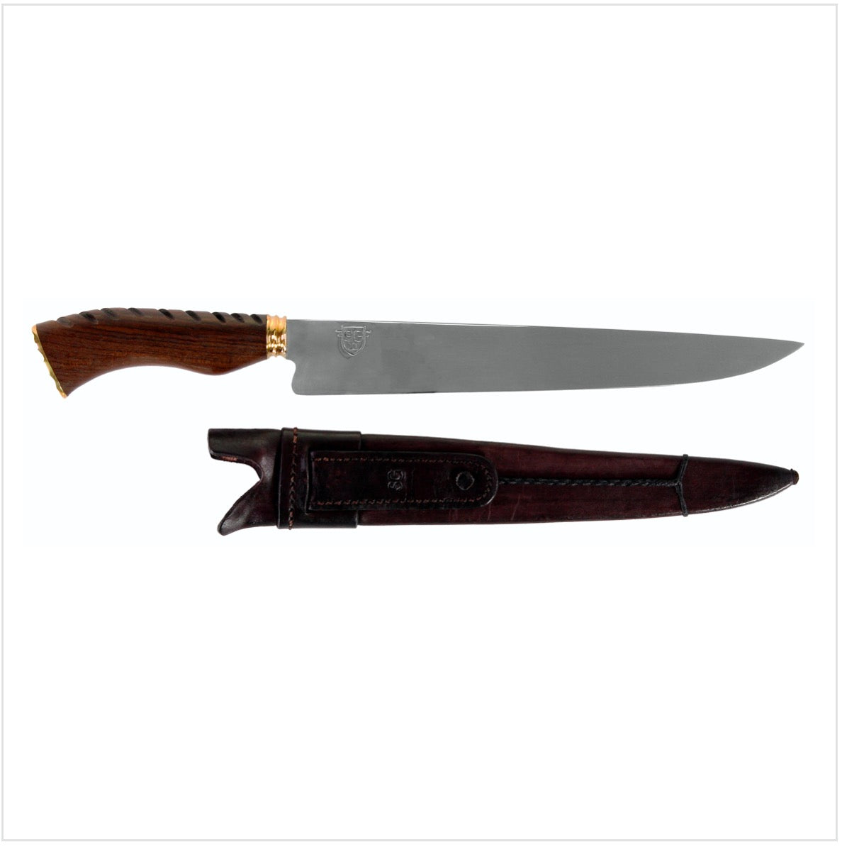 Couteau de cuisine massif de la manufacture de couteaux de haute qualité Serra Grande, ce Faca Campeira qui signifie couteau de campagne ou couteau des champs fait à la main, est le couteau traditionnel des agriculteurs et des bergers d'Amérique du Sud. Même les tâches les plus difficiles, telles que l'abattage, la dissection et la préparation des animaux de terrain, peuvent être facilement réalisées avec ce couteau. La longueur de sa lame de 22,8 centimètres et son épaisseur de 2 millimètres font de ce couteau la solution idéale pour toutes les tâches de cuisine impliquant de la viande et des légumes. Pour répondre aux normes les plus élevées, seuls les meilleurs matériaux sont utilisés dans la fabrication : La lame est fabriquée en acier suédois inoxydable (X46Cr13 / AISI 420 C). Son noble manche est fabriqué avec le bois de l'Imbuia, également appelé arbre à poivre ou noyer brésilien. Il est solide et durable, et grâce à un séchage, un lissage et un polissage minutieux, il offre un toucher merveilleux.