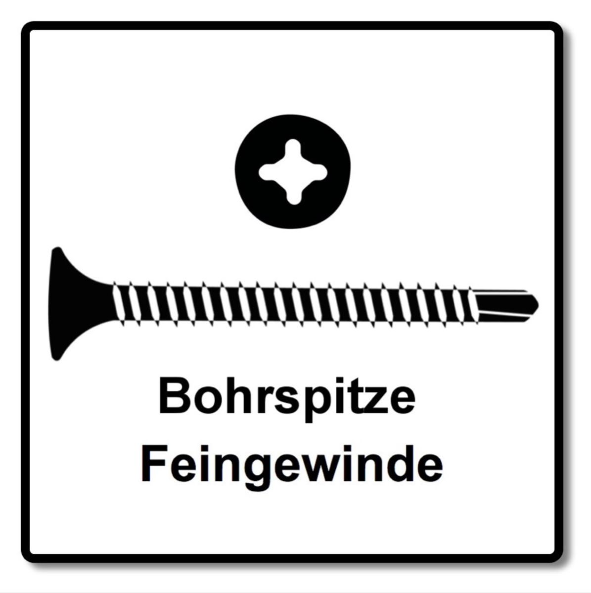 Les vis pour cloisons sèches conviennent à la fixation de plaques de plâtre sur des profilés métalliques jusqu'à 2,0 mm d'épaisseur. Le filetage en tôle des vis assure un vissage rapide et un maintien sûr lors du vissage dans des profilés métalliques renforcés. Le filetage complet permet d'absorber des forces de traction élevées et une pression de contact plus élevée lors du vissage. La tête de trompette sert à éviter la destruction de la couche de carton et donne à la plaque un maintien sûr. Un avantage clé du Phillips H2 est la transmission de puissance optimisée entre la vis et l'outil. Cela réduit la contrainte sur le matériau et augmente la quantité de transmission de force. Les deux petites arêtes coupantes de la pointe du foret rendent les vis particulièrement adaptées à la fixation et aux métaux. La couleur noire éclatante est le résultat de la phosphatation, une protection contre la corrosion qui garantit la résistance des vis à l'humidité. Les vis pour cloisons sèches garantissent toujours un maintien parfait des panneaux sur le cadre à montants et peuvent être fraisées au millimètre près.