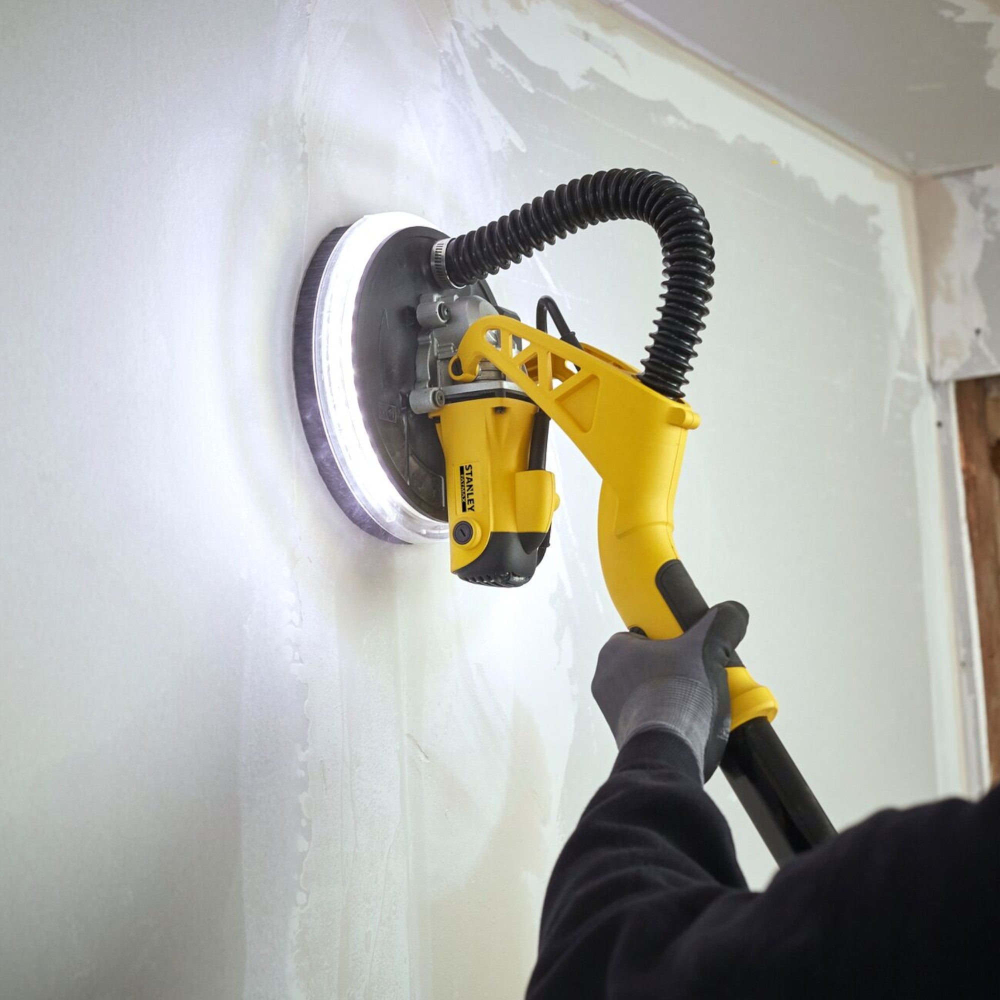La ponceuse pour cloisons sèches Stanley Fatmax SFMEE500S est la solution idéale pour les travaux de ponçage exigeants sur les murs et les plafonds. Avec son moteur robuste de 750 watts, elle fournit une grande efficacité de ponçage et permet de travailler rapidement et avec précision. Son design compact et ergonomique et sa construction légère permettent de réduire la fatigue, même lors d'utilisations prolongées. La présélection de la vitesse de rotation de 600 à 1 700 tr/min avec démarrage progressif offre une adaptation optimale aux différentes applications, tandis que l'anneau lumineux à LED éclaire la zone de travail et permet de visualiser les joints, les taches ou les irrégularités. La poignée télescopique, qui peut être étendue jusqu'à 180 cm, est idéale pour les travaux au plafond et les grandes surfaces à poncer. Le tuyau d'aspiration élastique permet une flexibilité maximale avec un angle de ponçage allant jusqu'à 120°, et la protection de ponçage amovible permet de poncer jusque dans les coins. Grâce au design incurvé du support de tête et aux surfaces de préhension caoutchoutées, la ponceuse offre un équilibre optimal et un grand confort d'utilisation. La poignée pliable et la trousse à outils fournie facilitent le rangement et le transport. La ponceuse Stanley Fatmax SFMEE500S est le choix parfait pour les travaux de construction à sec professionnels qui exigent efficacité, précision et confort.