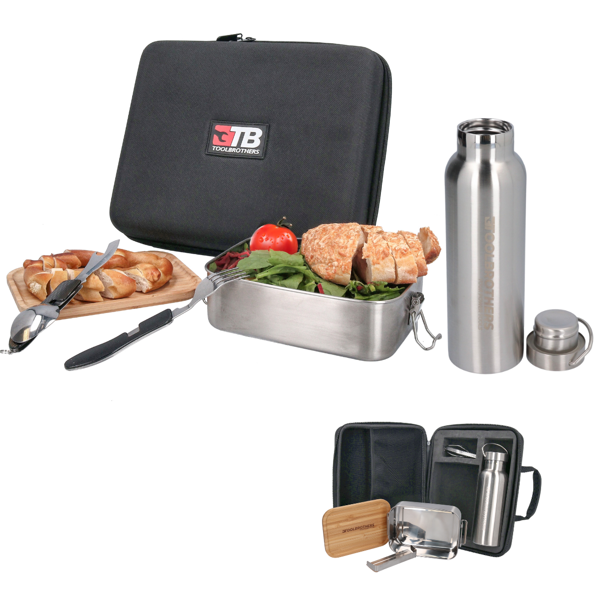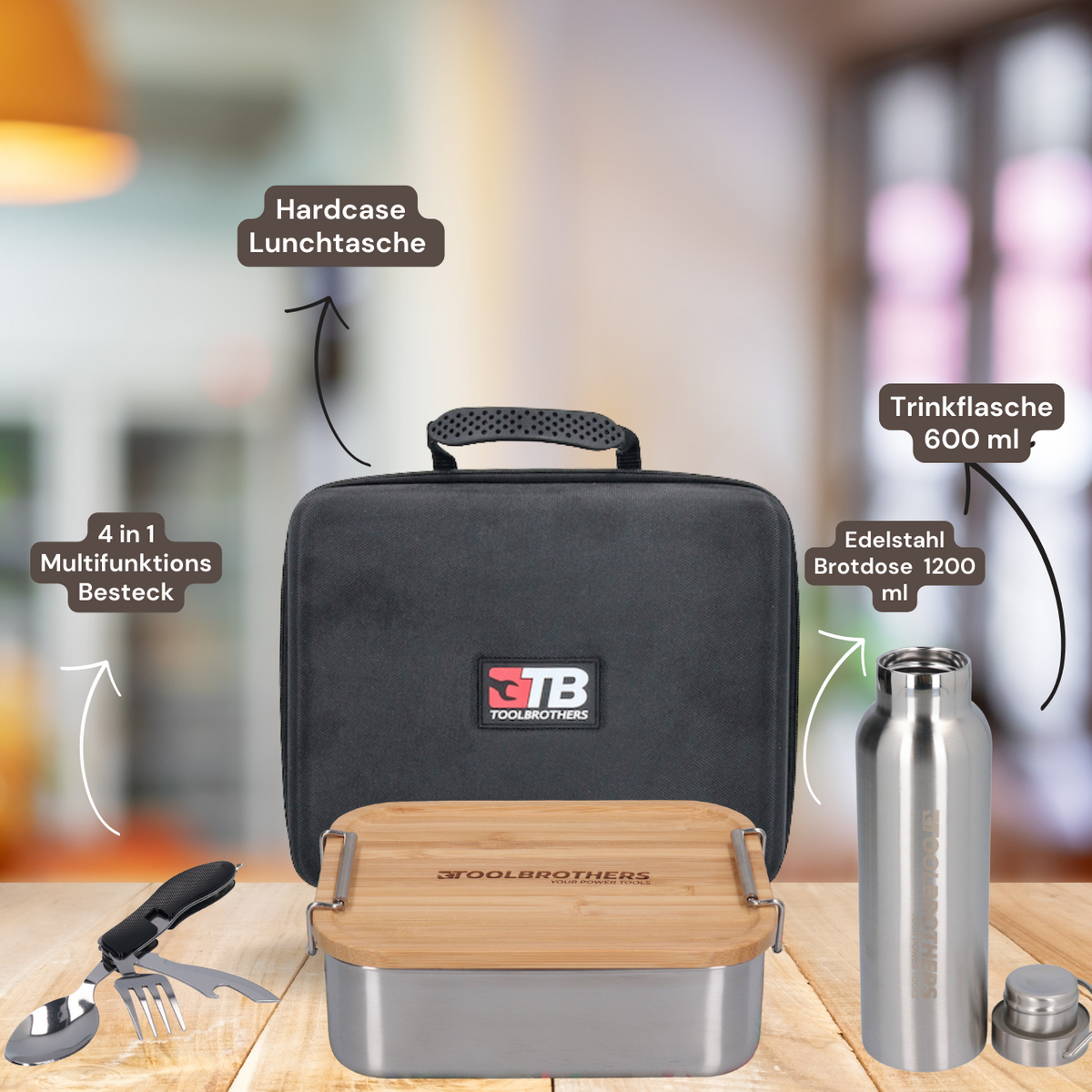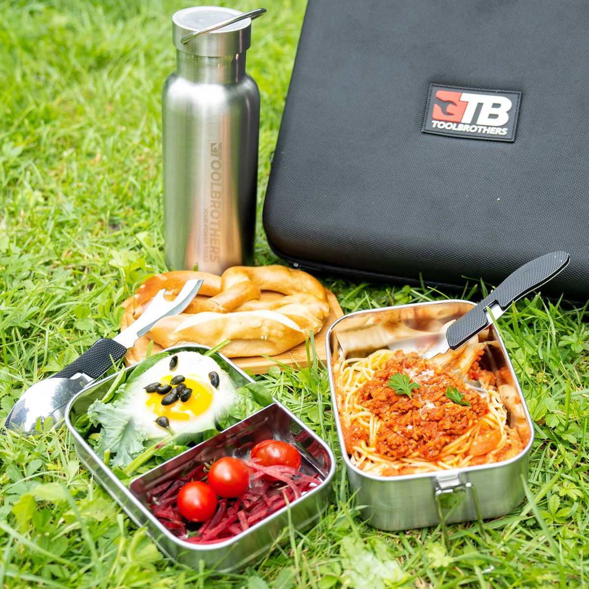 Tout en un seul endroit ! C'est le sens et le but de ce set de haute qualité. Le sac de transport Toolbrothers Hardcase maintient soigneusement et de manière fiable la température des aliments. Pour pouvoir manger à tout moment et en tout lieu, le set comprend des couverts universels multifonctionnels. Il comprend un couteau, une cuillère, une fourchette et un ouvre-bouteille pour les boissons fraîches après le travail. En outre, une gourde en acier inoxydable Toolbrothers Fan d'une contenance de 600 ml est incluse. En outre, la boîte à pain de haute qualité de la maison Toolbrothers est le compagnon parfait pour chaque artisan affamé.