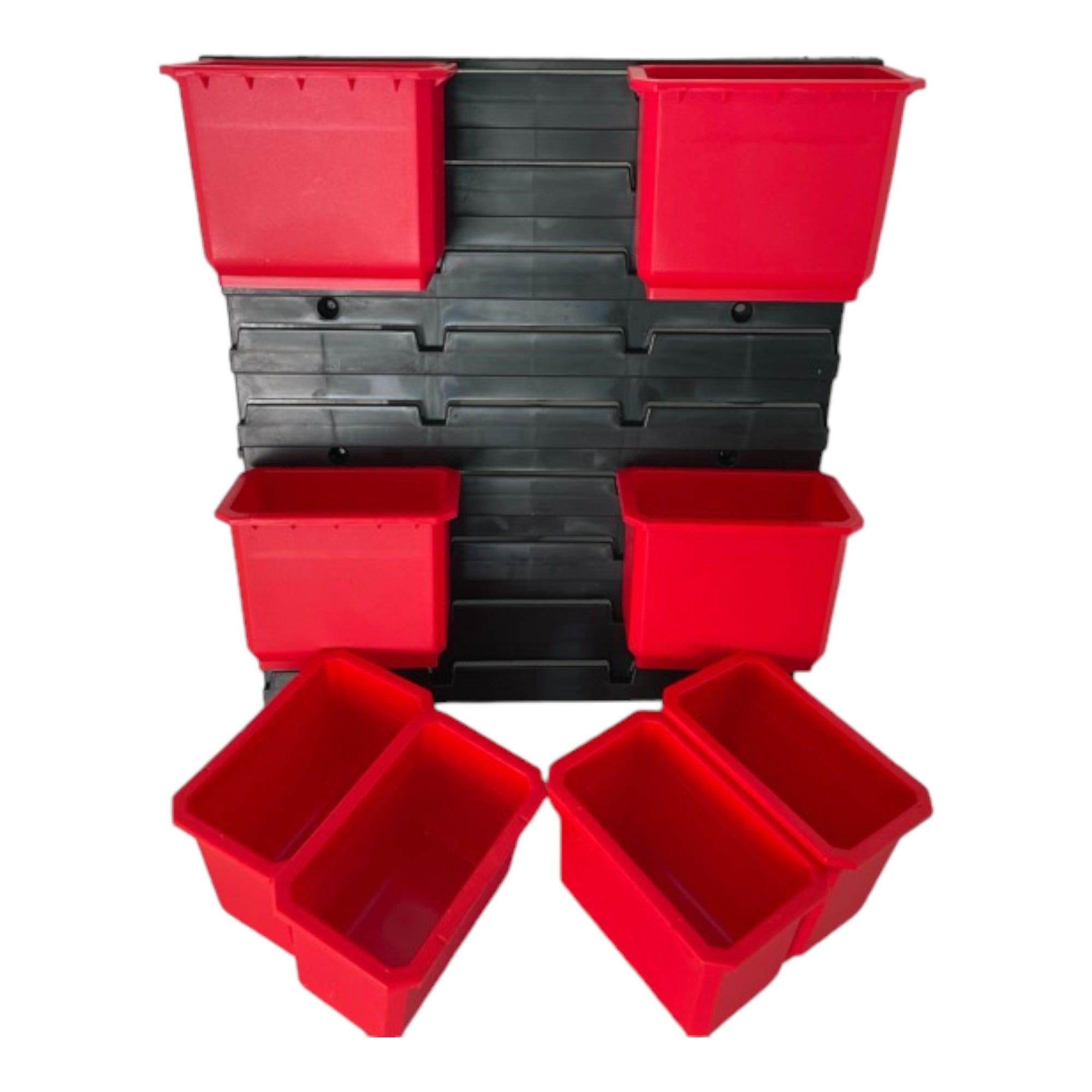 Avec le RHINO Container Set Nr. 2 de Toolbrothers, l'organisation de l'atelier n'est plus un problème. Les 8 conteneurs peuvent être fixés librement sur le mur de l'atelier, ce qui permet de profiter d'un alignement et d'un rangement individuels. La plaque se fixe facilement au mur. De plus, les bacs peuvent être placés dans les valises RHINO XXL, ce qui en fait un moyen de transport utilisable individuellement pour diverses petites pièces.