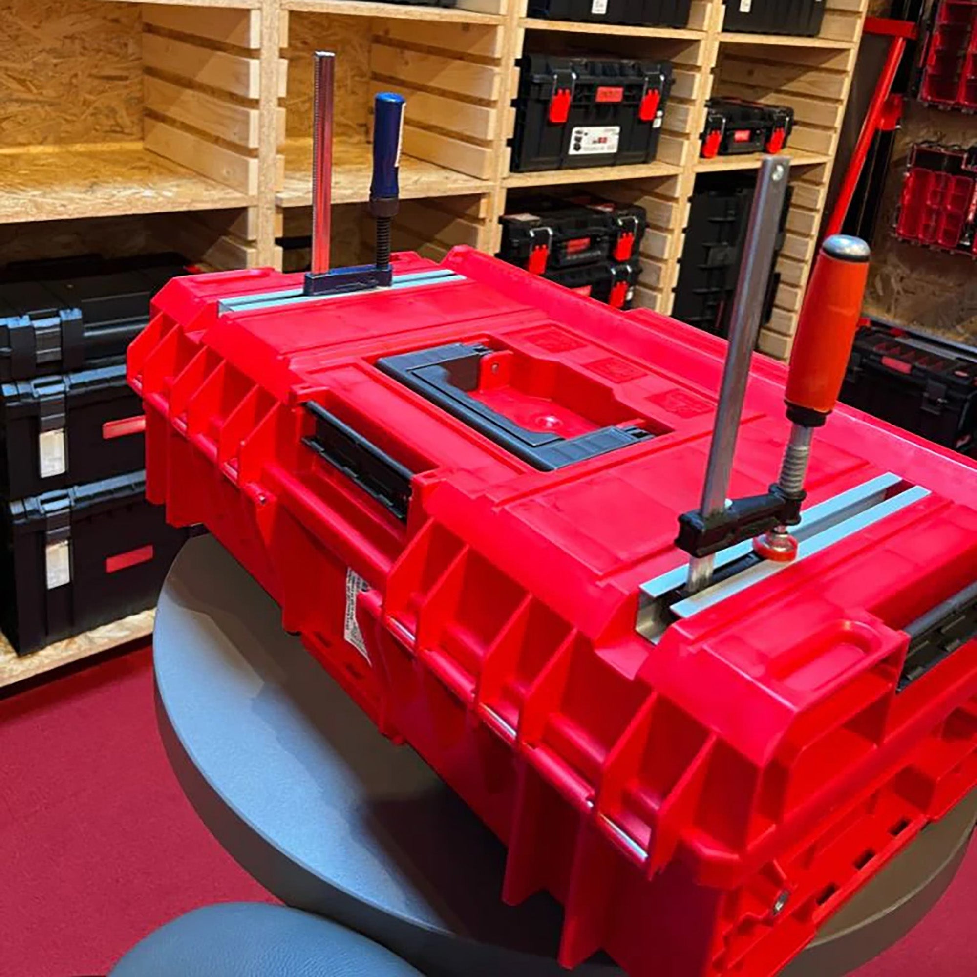 Particularités : Couvercle Work+ avec rails de montage en aluminium pour l'utilisation d'un serre-joint de charpentier classique directement sur la mallette, cloisons amovibles.