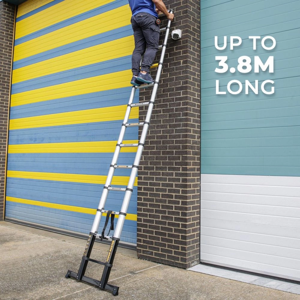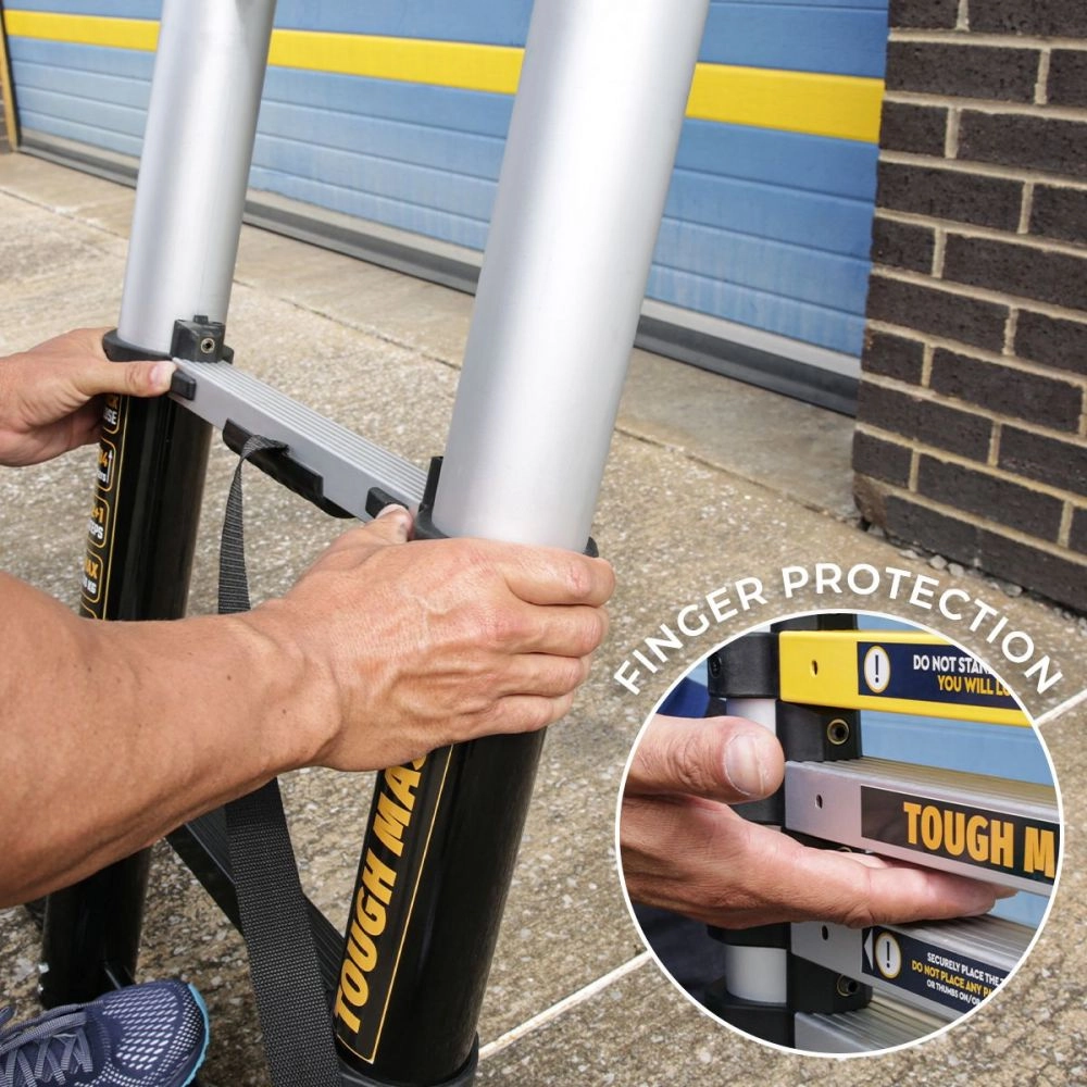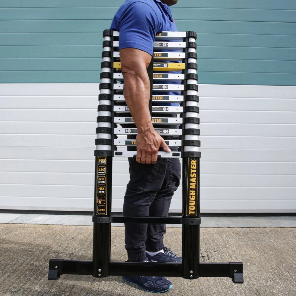 L'échelle télescopique TOUGH MASTER ML-1004A offre une facilité d'utilisation, se révèle durable et est d'une taille impressionnante. Grâce à ses profilés en aluminium de 1,3 mm d'épaisseur, cette échelle peut porter une charge maximale de 150 kg. De plus, lorsqu'elle est entièrement déployée, elle atteint une hauteur maximale de 3,8 m, ce qui est plus haut que la plupart des échelles extensibles. Cette échelle est dotée de plusieurs fonctions de sécurité pour garantir une utilisation sûre. Des marquages jaunes clairs permettent d'identifier clairement la hauteur maximale de l'échelle. Grâce à la barre de stabilisation intégrée à la base de l'échelle, ses pieds en caoutchouc antidérapants intégrés garantissent une utilisation stable, surtout lorsque vous utilisez l'échelle en position inclinée. Son mécanisme de verrouillage solide et sûr garantit également votre sécurité pendant l'utilisation. Pour éviter que vos doigts ne se coincent pendant que vous repliez l'échelle, ses barreaux sont espacés de 2,5 cm. Cette échelle téléscopique sera certainement votre meilleur allié pour tous les travaux à venir. Elle se replie très facilement et, puisqu'elle est compacte, elle est facile à transporter et à ranger. Parmi les autres propriétés, citons le système pratique de fixation par boutons qui vous permet de replier l'échelle en appuyant tout simplement sur deux boutons et de la ramener à 118 cm de longueur. Par ailleurs, cette échelle TOUGH MASTER est facile à transporter en raison de son faible poids de 15,87 kg et de la sangle fournie pour la maintenir fermement.