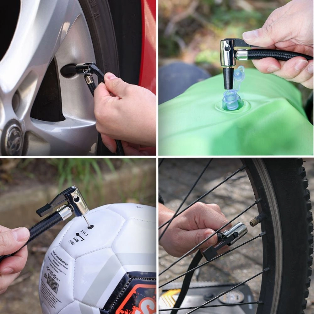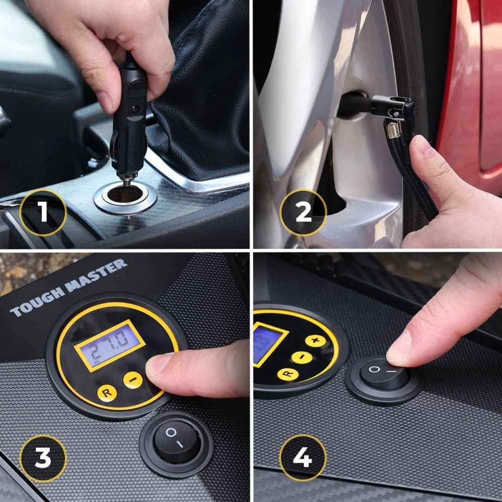 Avec le gonfleur digital TM-T110D de TOUGH MASTER, vous pouvez facilement gonfler les pneus de voiture typiques de 0 à 35 psi en 5-6 minutes grâce au puissant moteur à bobine en cuivre pur de 110 watts. Cette pompe à air pratique fournit une pression maximale de 150 PSI et convient au gonflage des pneus des SUV de taille moyenne et des petits véhicules. Outre les pneus de voiture et de moto, la pompe à air numérique peut également gonfler de nombreux autres articles à l'aide des embouts fournis. La livraison comprend un embout pour gonfler les bateaux pneumatiques, un embout adaptateur pour vélo pour gonfler les pneus de vélo et un embout adaptateur pour aiguille à bille pour les bouteilles et autres échelles de sport, échelles de jeu et autres bateaux pneumatiques. Le gonfleur de pneus de voiture est fabriqué en plastique ABS léger et résistant, et la chambre à air a été conçue pour résister à de fortes pressions, même avec un débit d'air maximal. L'un des avantages de cet appareil est sa fonction d'arrêt automatique qui vous permet de ne pas vous soucier d'une pression trop élevée ou trop faible. La pompe ne fonctionne que jusqu'à ce que la pression prédéfinie soit atteinte et s'arrête ensuite automatiquement. En outre, le compresseur d'air est doté d'un câble électrique de 3 mètres de long avec prise allume-cigare, ce qui vous garantit une grande portée et vous permet de gonfler sans problème les pneus avant et arrière de votre voiture. La batterie de votre voiture sert de source d'alimentation. Pour la mise en service, la fiche du câble peut être branchée sur l'allume-cigare du véhicule concerné. Lorsque vous n'utilisez pas le gonfleur électrique, vous pouvez facilement ranger le câble d'alimentation sur le côté de la pompe à pneus. De plus, le design compact du compresseur de voiture permet de le transporter et de le ranger facilement. Parmi les autres avantages, citons les LED intégrées qui vous permettent d'éclairer votre zone de travail, l'écran LCD numérique qui vous permet de contrôler facilement le niveau de pression même dans des conditions de faible luminosité, un petit sac de transport pour ranger le contenu et la possibilité de choisir entre les unités kg/cm2, BAR, PSI ou KPA.