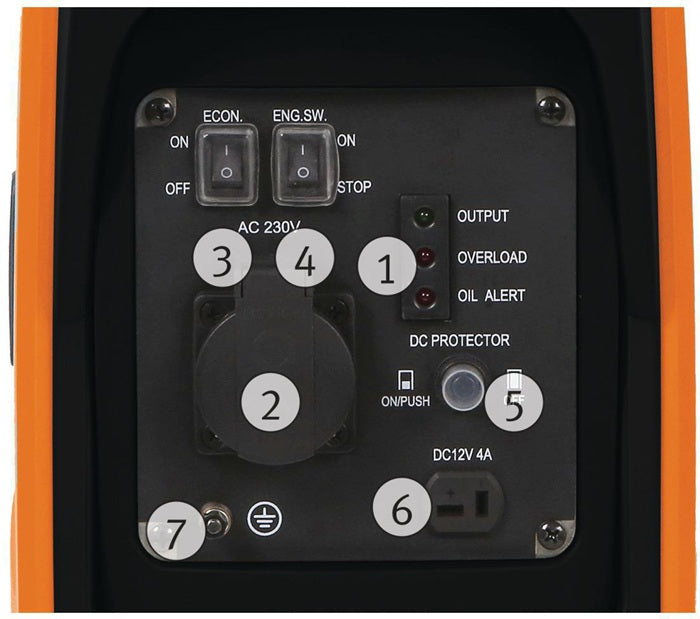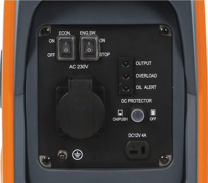 Technologie Inverter pour des performances constantes · pour la maison et le jardin, le camping, les caravanes, les bateaux, les ordinateurs et autres appareils électroniques sensibles · Le mode Eco régule la vitesse en fonction de la consommation électrique · Starter pour des démarrages à froid sans problème · Témoins lumineux pour la tension de sortie, la surcharge et manque d'huile · Protection contre les surcharges par interrupteur de protection thermique · Arrêt en cas de manque d'huile avec voyant d'avertissement livraison sans huile moteur (15 W 40)