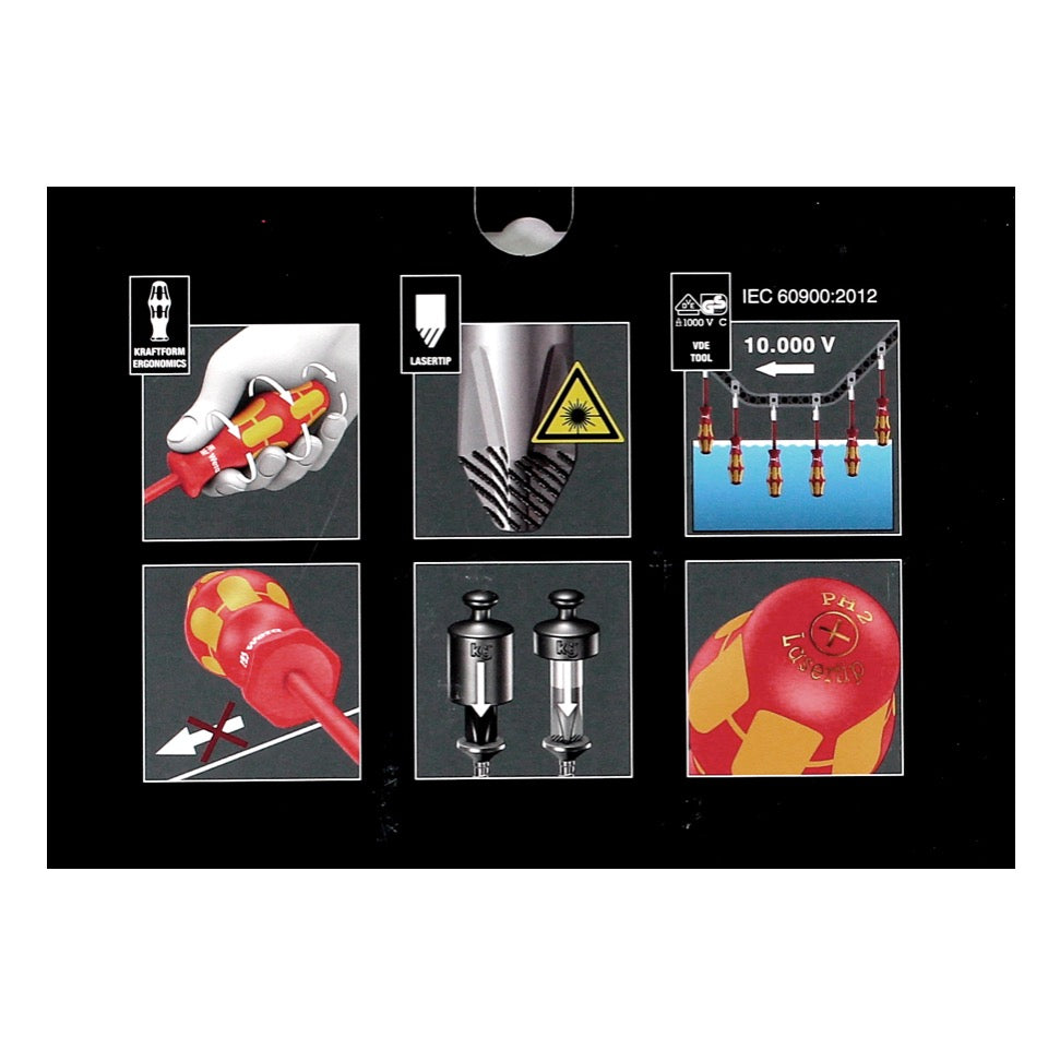 Les tournevis Wera Kraftform Plus 100 VDE séduisent par leur très grande qualité, leur design attrayant et leurs tournevis testés un à un conformément à la norme IEC60900. Ces tournevis assurent une transmission de puissance très élevée tout en demandant très peu d'efforts. Cela réduit considérablement la charge sur l'ensemble du système main-bras. De plus, les outils sont conçus pour fonctionner en toute sécurité jusqu'à 1 000 volts. Les pointes laser offrent une meilleure prise et une meilleure adhérence à la tête de la vis. Deux zones de préhension différentes sont intégrées dans la poignée. Alors que les zones dures assurent une vitesse de travail plus élevée, les zones plus souples garantissent une transmission de couple plus importante. Un confort supplémentaire est assuré par les poignées hexagonales de protection contre le roulage, qui protègent les tournevis contre les roulages fastidieux.