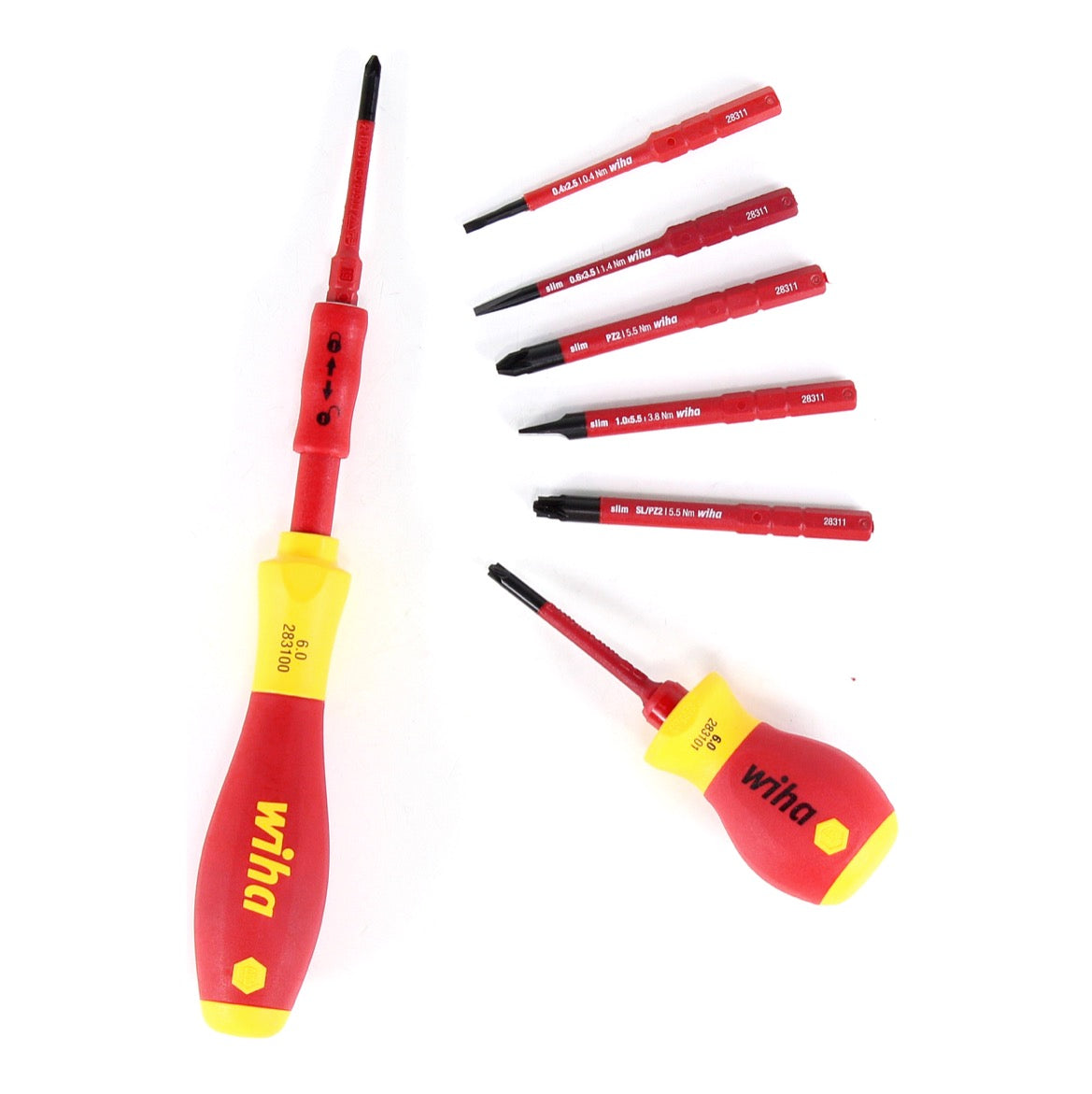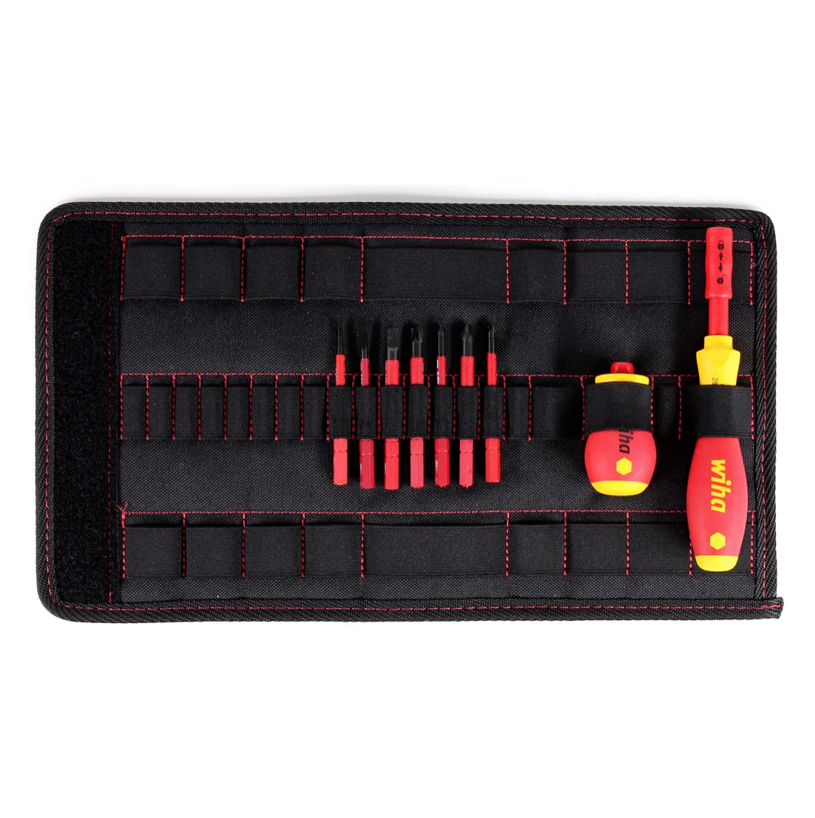 En cas de travaux dans des lieux différents, par ex. sur des chantiers, des installations solaires et des armoires électriques, de nombreuses empreintes de vis sont requises. Le jeu de tournevis slimVario® avec embouts slimBit couvre les empreintes de vis courantes et offre donc une grande flexibilité d'utilisation. Rangés de manière ordonnée et sécurisée dans une trousse solide, les outils pour électriciens conviennent parfaitement à l'utilisation mobile. Le jeu d'outils de 9 pièces offre un gain de place optimal grâce à un système complet d'embouts interchangeables. Grâce à la slimTECHNOGOLY Wiha, les embouts slimBit compris dans le jeu et leur lame jusqu'à 33 % plus minces, permettent également d'accéder facilement à des éléments à vis ou à ressort situés en profondeur. En combinaison avec le manche Stubby extra-court, vous pouvez facilement accéder aux vis en particulier dans les espaces étroits. Le manche longitudinal est utilisé pour les vis situées en profondeur et pour les transmissions de force plus importantes. Tous les outils compris dans le jeu sont tous soumis à un test individuel selon la norme internationale IEC 60900 et permettent de travailler en sécurité sur des pièces sous tension jusqu'à 1 000 V AC.