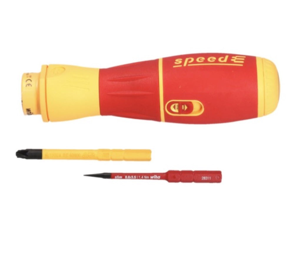 Le Wiha speedE II triple votre vitesse de travail. Le tournevis électrique de haute qualité est une immense simplification du travail pour chaque artisan. Les conséquences sur la santé du vissage manuel incluent : douleurs au poignet, inflammation des tendons et bien plus encore. Le speedE II offre la possibilité de minimiser efficacement cela. La combinaison de la facilité de travail et de la poignée ergonomique a convaincu les médecins et les thérapeutes de l'AGR. La technologie sophistiquée au cœur du tournevis est parfaitement adaptée aux connexions à vis sensibles. La fonction de protection du matériau intégrée garantit qu'il s'éteint à 0,4 Nm, et l'utilisateur peut serrer soigneusement les derniers millimètres à la main si nécessaire. De plus, le speedE dispose naturellement d'un interrupteur à glissière qui permet un vissage de 1 Nm, ce qui signifie qu'un travail de vissage plus puissant est également possible. Et si tout cela ne suffit pas, vous pouvez bien sûr faire du vissage manuel jusqu'à 12 Nm sans endommager le tournevis. Le speedE est également conçu pour un environnement de travail peu éclairé, il dispose d'une lumière LED intégrée qui fournit toujours les meilleures conditions d'éclairage possibles. De plus, la convivialité encore meilleure, le grand interrupteur à anneau et la très bonne concentricité se distinguent. Comme vous pouvez le voir, la combinaison de travaux pénibles est possible, en tenant compte du maintien de la santé. Qu'il s'agisse d'installation de prises, de travaux sur l'armoire électrique, de travaux industriels, de travaux généraux sur les moteurs, dans le domaine de la climatisation et des installations sanitaires ou à la maison, le speedE II facilite grandement le travail de chaque utilisateur. Les slimBits isolés fournis sont idéaux pour les applications électriques. Grâce à la slimTechnology, les éléments à vis et à ressort bas sont également facilement accessibles. Ceci est rendu possible par l'isolation de protection intégrée dans la zone avant du mors. Les slimBits peuvent garantir un travail sûr sur des pièces sous tension jusqu'à 1000 V AC. Les slimBits ne sont pas seulement compatibles avec ce tournevis, mais également avec tous les autres outils slimVario. Ils ne conviennent pas au fonctionnement de la machine. L'ensemble slimBit de 6 pièces augmente l'efficacité, car il y a un énorme gain de place grâce au vaste système de lames interchangeables. Les embouts sont également testés VDE.